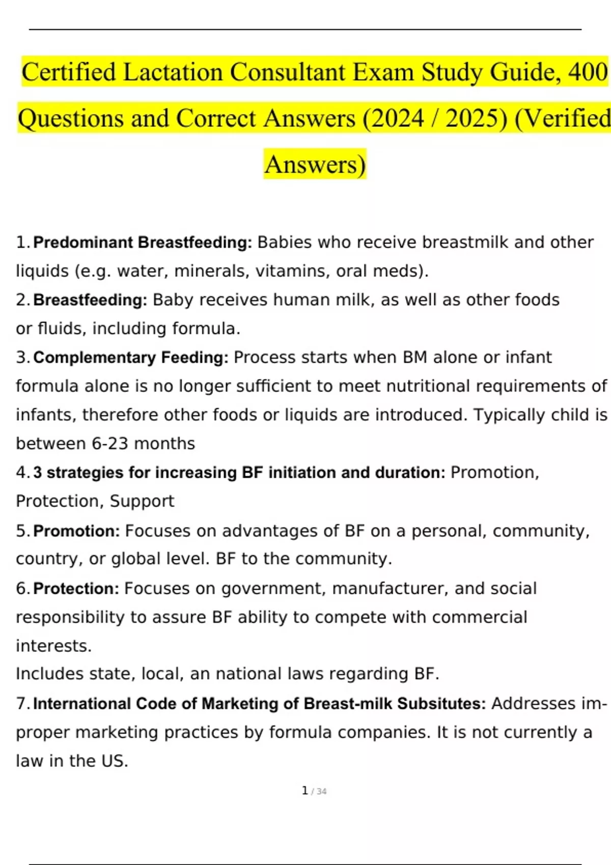Certified Lactation Consultant Exam Study Guide, 400 Questions and Answers (2024 / 2025) (Verified Answers)