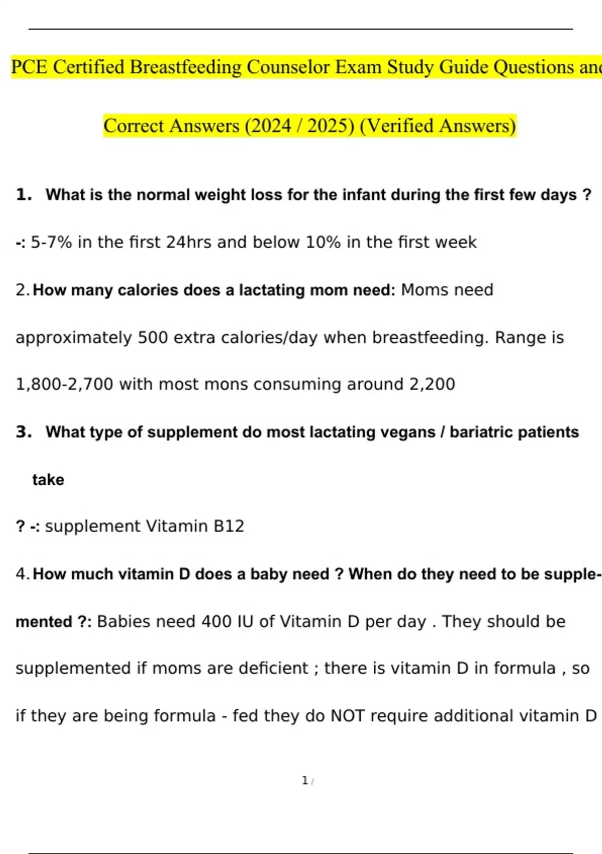 PCE Certified Breastfeeding Counselor Exam Study Guide Questions and Answers (2024 / 2025) (Verified Answers)