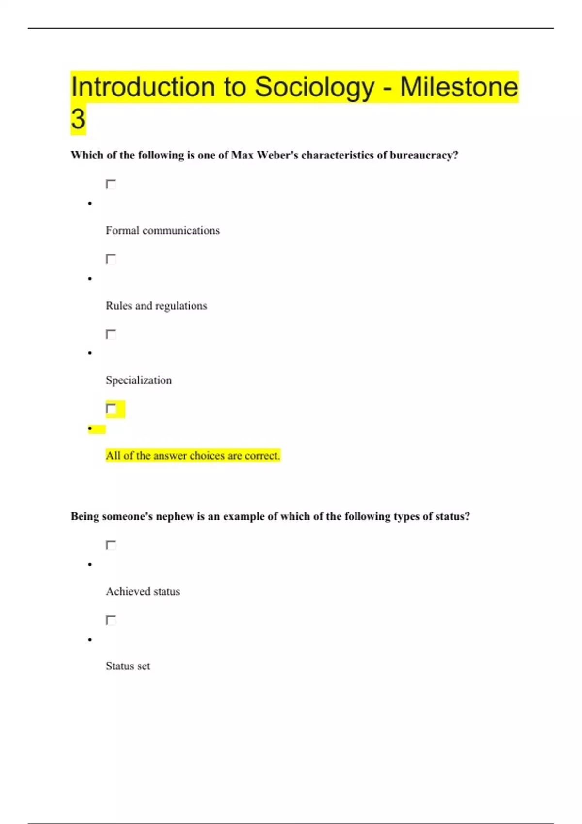 Introduction to Sociology - Milestone 3 Which of the following is one of Max Weber's characteristics of bureaucracy? • Formal communications • Rules and regulations • Specialization • All of the answer choices are correct. Being someone's nephew is an example of which of the following types of status? • Achieved status • Status set • Ascribed status Which of the following is a potential advantage of modern reproductive technologies, such as in vitro fertilization? • They may help to reduce serious birth defects. • They provide couples who cannot conceive the opportunity to have a child. • They may increase the odds of couples having a healthy baby. • All of the answer choices are correct. Which of the following statements correctly describes the relationship between total institutions and resocialization? • Resocialization occurs within a total institution. • Total institutions cannot exist without resocialization. • Resocialization gives people their identities, and total institutions break those identities down. •