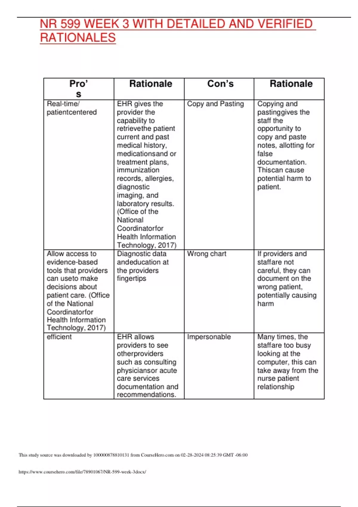 NR 599 WEEK 3 WITH DETAILED AND VERIFIED RATIONALES Pro’ s Rationale Con’s Rationale Real-time/ patientcentered EHR gives the provider the capability to retrievethe patient current and past medical history, medicationsand or treatment plans, immunization records, allergies, diagnostic imaging, and laboratory results. (Office of the National Coordinatorfor Health Information Technology, 2017) Copy and Pasting Copying and pastinggives the staff the opportunity to copy and paste notes, allotting for false documentation. Thiscan cause potential harm to patient. Allow access to evidence-based tools that providers can useto make decisions about patient care. (Office of the National Coordinatorfor Health Information Technology, 2017) Diagnostic data andeducation at the providers fingertips Wrong chart If providers and staffare not careful, they can document on the wrong patient, potentially causing harm efficient EHR allows providers to see otherproviders such as consulting physiciansor acute care services documentation and recommendations. Impersonable Many times, the staffare too busy looking at the computer, this can take away from the nurse patient relationship This study source was downloaded by from CourseH on :25:39 GMT -06:00 Increases patient participation Providers and patients who share access to electronichealth information can collaborate in informed decision making. (Office of the National Coordinator for Health Information Te