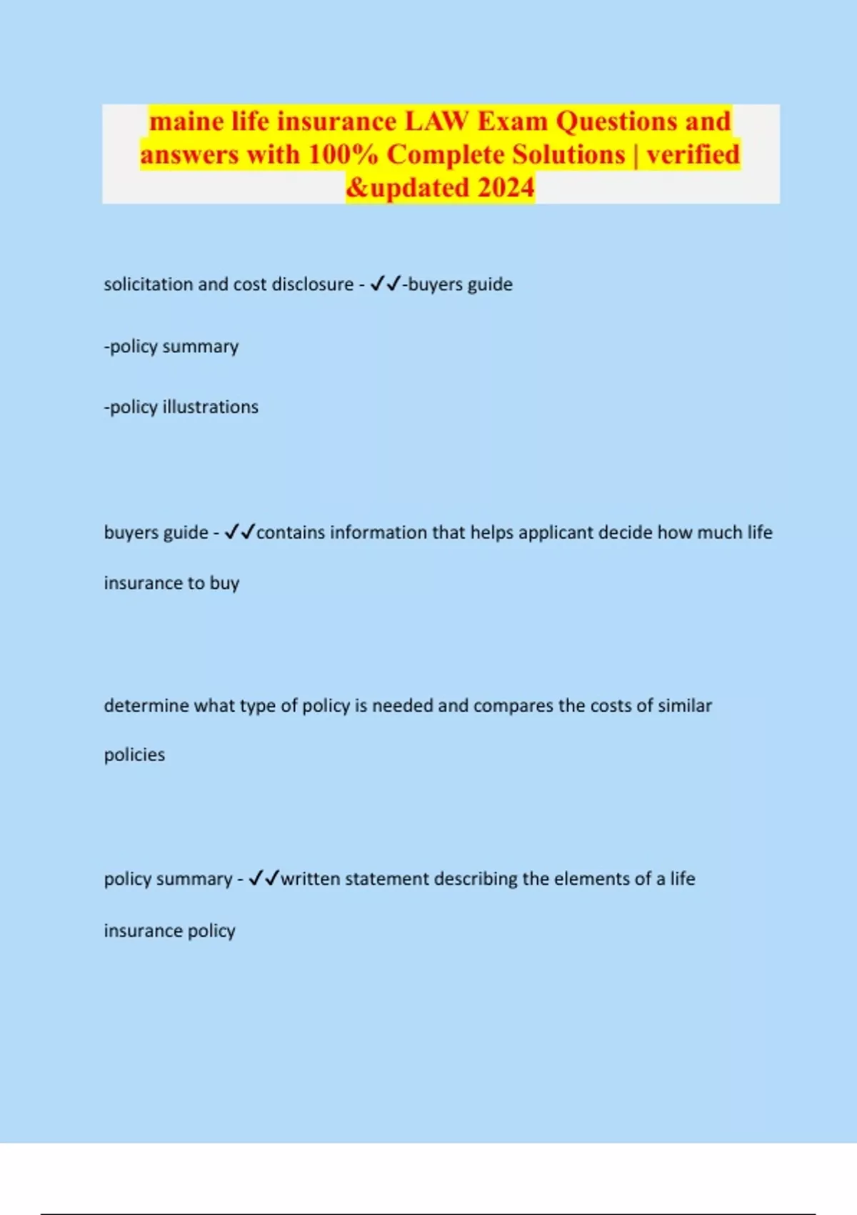 maine life insurance LAW Exam Questions and answers with 100% Complete Solutions | verified &updated 2024