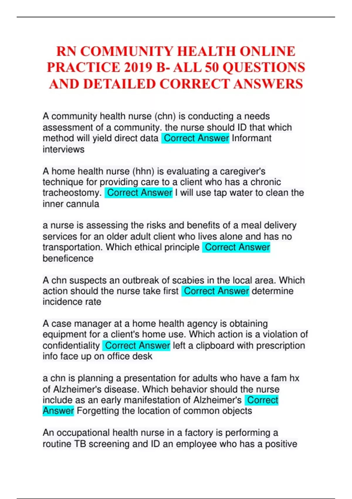 RN COMMUNITY HEALTH ONLINE PRACTICE 2019 B- ALL 50 QUESTIONS AND DETAILED CORRECT ANSWERS A community health nurse (chn) is conducting a needs assessment of a community. the nurse should ID that which method will yield direct data Correct Answer Informant interviews A home health nurse (hhn) is evaluating a caregiver's technique for providing care to a client who has a chronic tracheostomy. Correct Answer I will use tap water to clean the inner cannula