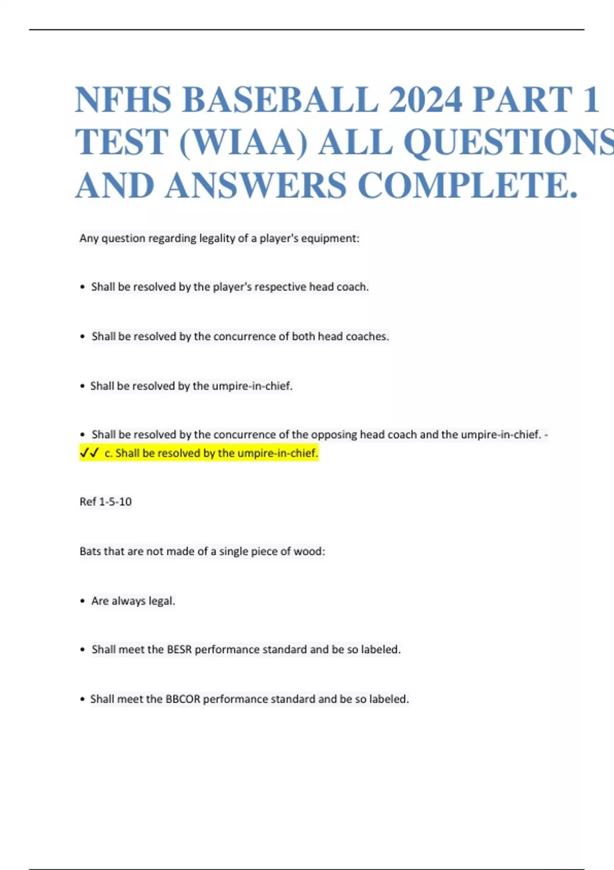NFHS BASEBALL 2024 PART 1 TEST (WIAA) ALL QUESTIONS AND ANSWERS COMPLETE.