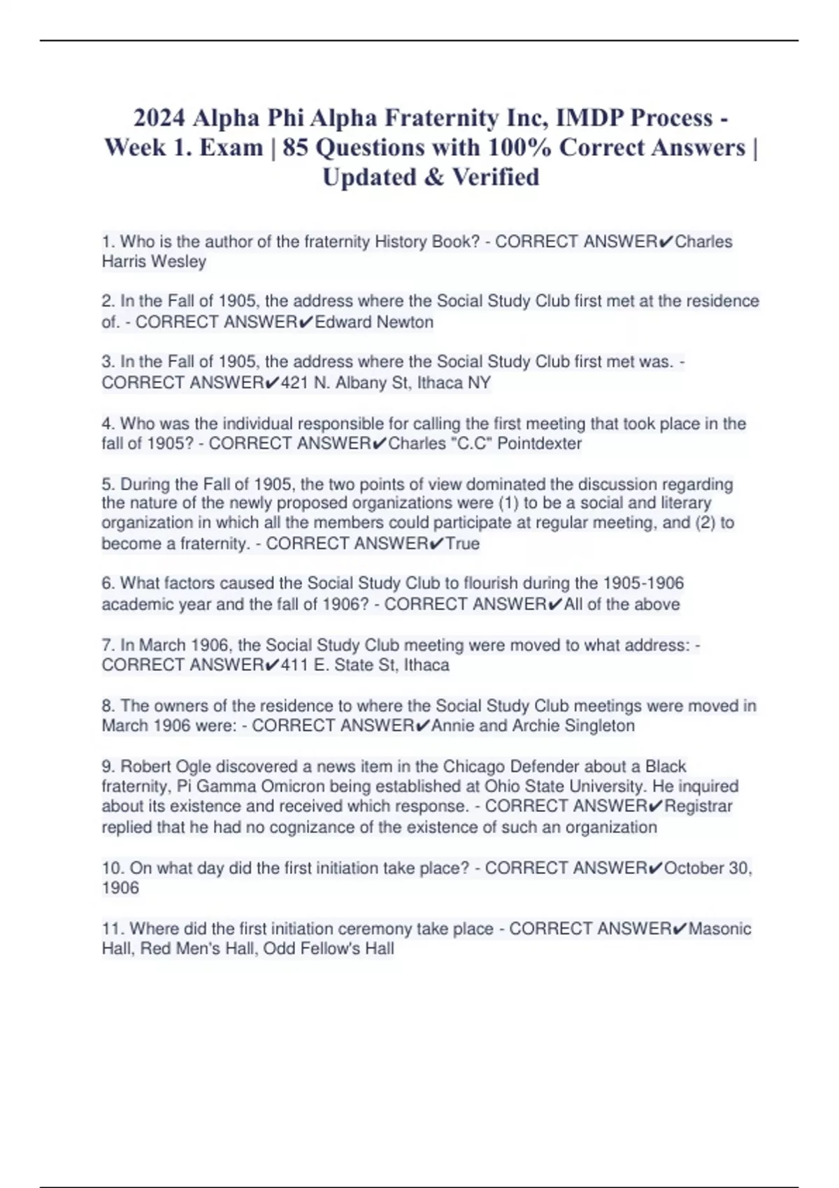 2024 Alpha Phi Alpha Fraternity Inc, IMDP Process - Week 1. Exam | 85 Questions with 100% Correct Answers | Updated & Verified 1. Who is the author of the fraternity History Book? - CORRECT ANSWERCharles Harris Wesley 2. In the Fall of 1905, the address where the Social Study Club first met at the residence of. - CORRECT ANSWEREdward Newton 3. In the Fall of 1905, the address where the Social Study Club first met was. - CORRECT ANSWER421 N. Albany St, Ithaca NY 4. Who was the individual responsible for calling the first meeting that took place in the fall of 1905? - CORRECT ANSWERCharles "C.C" Pointdexter 5. During the Fall of 1905, the two points of view dominated the discussion regarding the nature of the newly proposed organizations were (1) to be a social and literary organization in which all the members could participate at regular meeting, and (2) to become a fraternity. - CORRECT ANSWERTrue 6. What factors caused the Social Study Club to flourish during the academic year and the fall of 1906? - CORRECT ANSWERAll of the above 7. In March 1906, the Social Study Club meeting were moved to what address: - CORRECT ANSWER411 E. State St, Ithaca 8. The owners of the residence to where the Social Study Club meetings were moved in March 1906 were: - CORRECT ANSWERAnnie and Archie Singleton 9. Robert Ogle discovered a news item in the Chicago Defender about a Black fraternity, Pi Gamma Omicron being established at Ohio State University. He inquired about its existence and received which response. - CORRECT ANSWERRegistrar replied that he had no cognizance of the existence of such an organization 10. On what day did the first initiation take place? - CORRECT ANSWEROctober 30, 1906 11. Where did the first initiation ceremony take place - CORRECT ANSWERMasonic Hall, Red Men's Hall, Odd Fellow's Hall 12. Who is credited with proposing the fraternity colors? - CORRECT ANSWER Robert Harold Ogle 13. What are the fraternity colors? - CORRECT ANSWEROld Gold and Black 14. Who is credited with naming the society because he proposed the motion which was accepted? - CORRECT ANSWERGeorge Biddle Kelley 15. Despite being credited with naming the organization, the Brother who was given this honor says the credit should really go to this person because they researched/worked out the name? - CORRECT ANSWERHenry Arthur Callis 16. The first initiation banquet, had many delectable delights. Choose the items which were on the menu. - CORRECT ANSWERCream Tomato Soup, Salted Wafers, Neapolitan Ice Cream, Peas In Tub, Cheese, Broiled Lamb Chops, Lady Fingers, Brotherhood Smoke, Mashed Brown Potatoes, Chocolate Cake, Olives, Finger Rolls, Crackers, Shrimp Salad, Alpha Phi Alpha Punch, Rolled Bread, Wild Apple Jelly, 17. On the founding date, a meeting took place where the decision to become a Fraternity was deliberate. Whose letter of resignation was heard? - CORRECT ANSWERCharles "C.C." Poindexter 18. Which of the following are considered Founders of Alpha Phi Alpha Fraternity, Inc: - CORRECT ANSWERHenry Arthur Callis, Charles Henry Chapman, Eugene Knickle Jones, George Biddle Kelley, Nathaniel Allison Murray, Robert Harold Ogle, Vertner Woodson Tandy. 19. The Founders of Alpha Phi Alpha Fraternity, Inc are commonly and lovingly referred to as: - CORRECT ANSWERJewels 20. Who holds the distinction of being a founder and first initiate? - CORRECT ANSWEREugene Knickle Jones 21. What is a shingle? - CORRECT ANSWERCertificate of membership which states that one is a duly initiated member of Alpha Phi Alpha Fraternity Inc. 22. Who is credited with designing the first Shingle: - CORRECT ANSWERHenry Arthur Callis 23. Who is credited with designing the fraternity pin: - CORRECT ANSWERVertner Woodson Tandy 24. Who is considered the precursor of Alpha? - CORRECT ANSWERCharles Cardozo CC Poindexter 25. The date of the first incorporation is: - CORRECT ANSWERJanuary 29th, 1908 26. The first incorporation took place in: - CORRECT ANSWERAlbany, NY 27. With regards to the Ritual of Alpha Phi Alpha Fraternity, Inc who was on the first ritual committee? - CORRECT ANSWERGeorge Biddle Kelley, Robert Harold Ogle 28. With regards to the Ritual of Alpha Phi Alpha Fraternity, Inc, who was on the second ritual committee? - CORRECT ANSWEREugene Knickle Jones, Henry Arthur Callie 29. With regards to the Ritual of Alpha Phi Alpha Fraternity, Inc, the ritual of 1907 was unique in that: - CORRECT ANSWERAll of the above 30. Pick the one(s) which are part of the vision/objectives of Alpha Phi Alpha Fraternity, Inc: - CORRECT ANSWERAll of the above 31. The aims of Alpha Phi Alpha Fraternity, Inc are: - CORRECT ANSWERManly Deeds, Scholarship and Love for all Mankind 32. The first of Alpha's National Projects was created when a motion by Bro. H E. Moore passed at the Twelfth Annual Convention in 1919. It created out signature education program called: - CORRECT ANSWERGo to high school, Go to College 33. This beloved women is considered the "Mother of Alpha" - CORRECT ANSWER Annie Singleton 34. This founder of Alpha Phi Alpha Fraternity, Inc. entered higher education and eventually became professor of Agriculture at what is now Florida A&M University and was the first to enter our Chapter for deceased Brothers: - CORRECT ANSWER Charles Henry Chapman 35. This founder of Alpha Phi Alpha Fraternity, Inc. returned home to Washington, DC. after leaving Cornell, where he taught in public schools. Much of his career was spent at Armstrong Vocational High School in the District of Columbia: - CORRECT ANSWER Nathaniel Allison Murray 36. This founder of Alpha Phi Alpha Fraternity, Inc. was Alpha Chapter's first president and graduated with a degree in civil engineering. He became the first African American engineer registered in the state of New York: - CORRECT ANSWERGeorge Biddle Kelley 37. This founder of Alpha Phi Alpha Fraternity, Inc. became the state of New York's first registered black architect, with offices on Broadway in New York City. He holds the d