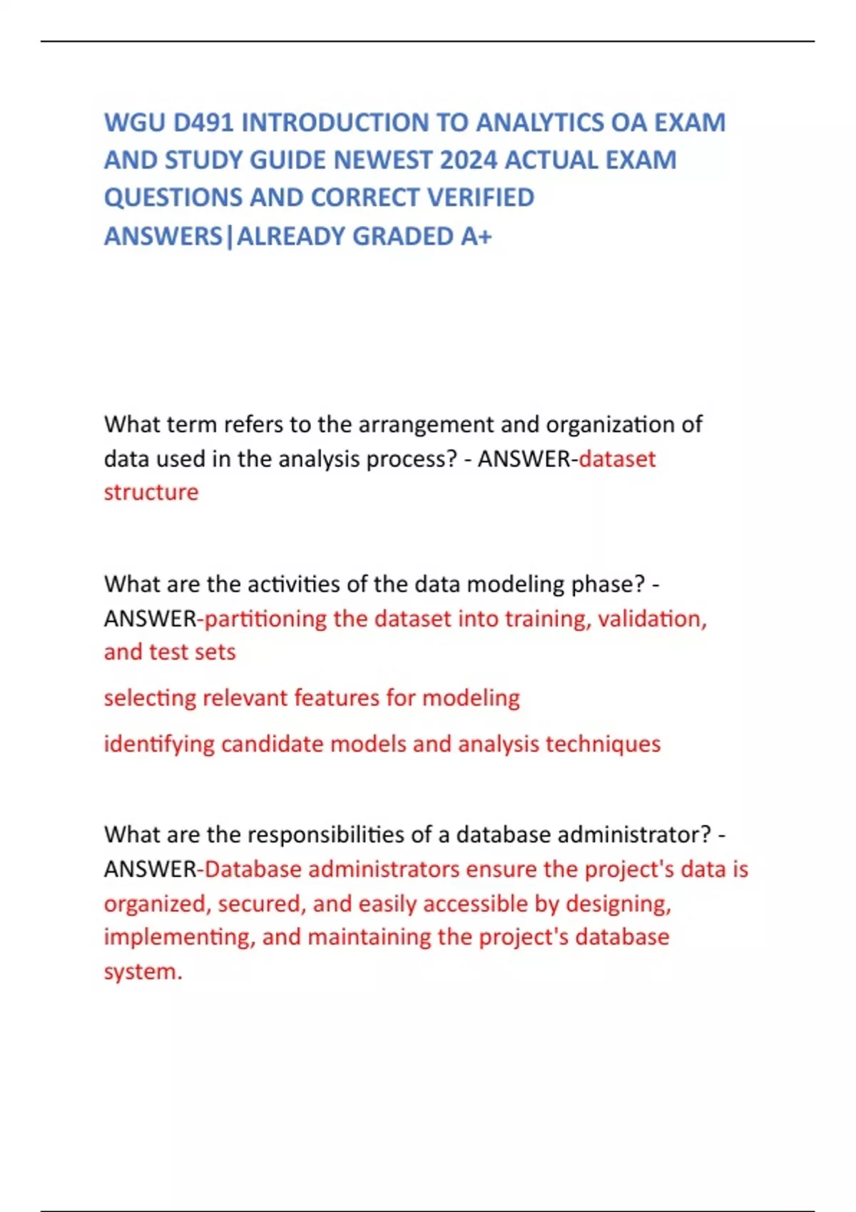 WGU D491 INTRODUCTION TO ANALYTICS OA EXAM AND STUDY GUIDE NEWEST 2024 ACTUAL EXAM QUESTIONS AND CORRECT VERIFIED ANSWERS|ALREADY GRADED A+