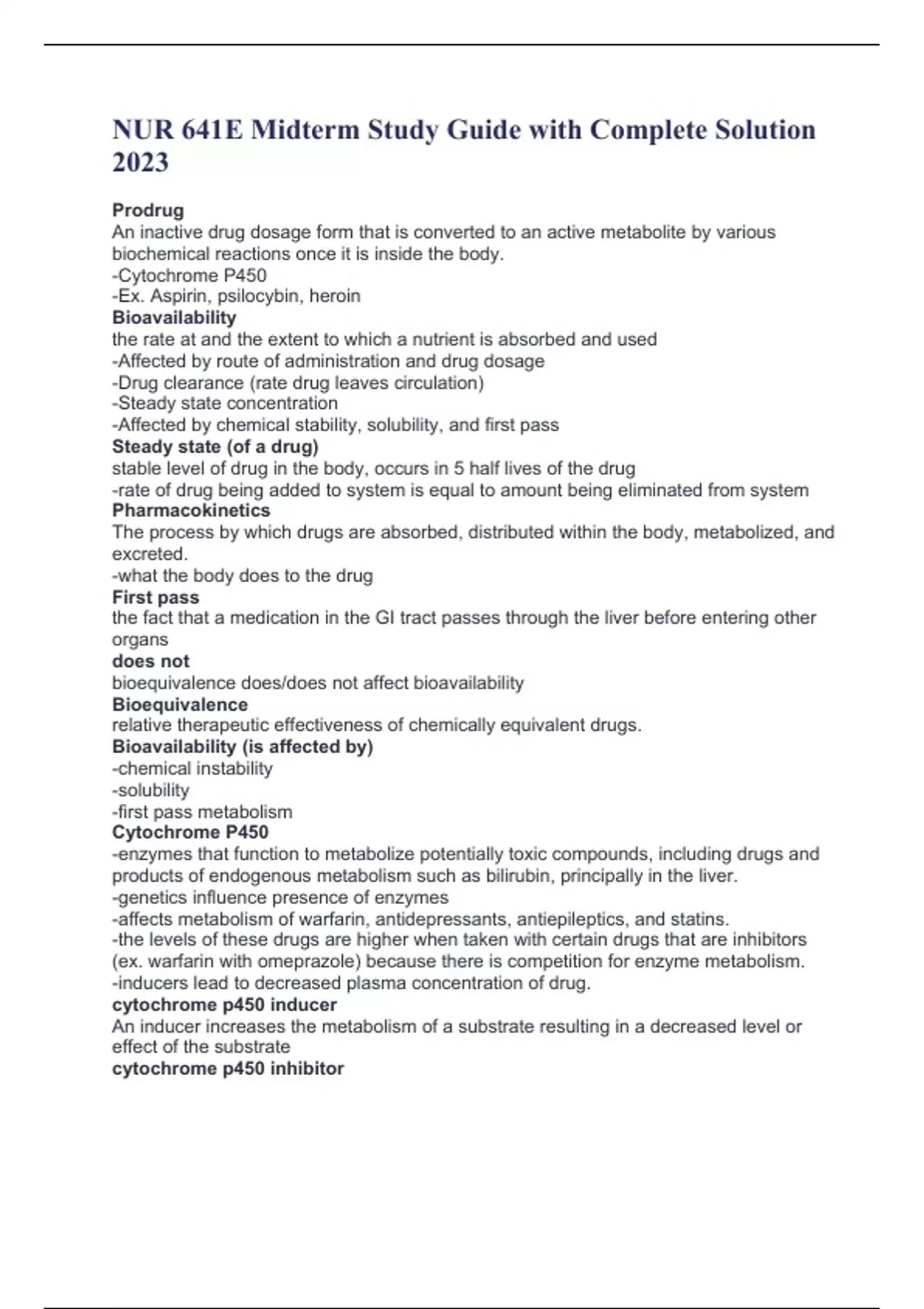 NUR 641E Midterm Study Guide with Complete Solution 2023 Prodrug An inactive drug dosage form that is converted to an active metabolite by various biochemical reactions once it is inside the body. -Cytochrome P450 -Ex. Aspirin, psilocybin, heroin Bioavailability the rate at and the extent to which a nutrient is absorbed and used -Affected by route of administration and drug dosage -Drug clearance (rate drug leaves circulation) -Steady state concentration -Affected by chemical stability, solubility, and first pass