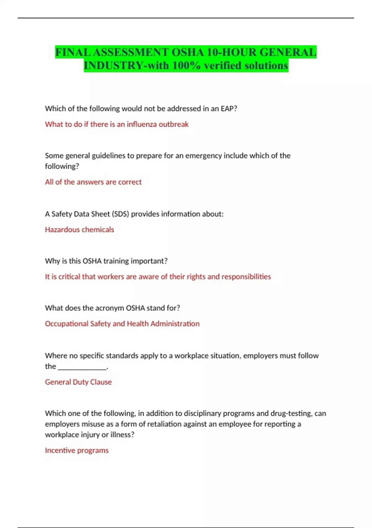 FINAL ASSESSMENT OSHA 10-HOUR GENERAL INDUSTRY-with 100% verified solutions