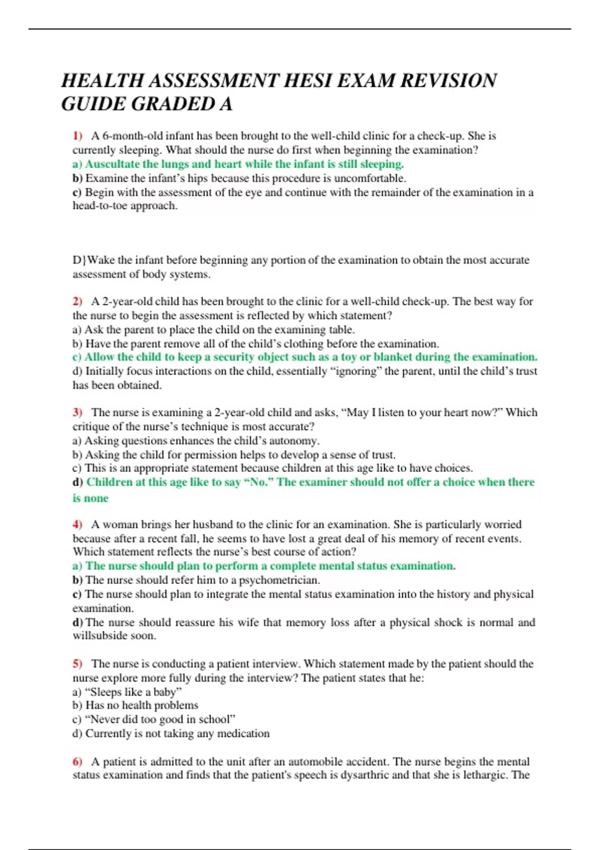 HEALTH ASSESSMENT HESI EXAM REVISION GUIDE GRADED A 1) A 6-month-old infant has been brought to the well-child clinic for a check-up. She is currently sleeping. What should the nurse do first when beginning the examination? a) Auscultate the lungs and heart while the infant is still sleeping. b) Examine the infant’s hips because this procedure is uncomfortable. c) Begin with the assessment of the eye and continue with the remainder of the examination in a head-to-toe approach. D}Wake the infant before beginning any portion of the examination to obtain the most accurate assessment of body systems. 2) A 2-year-old child has been brought to the clinic for a well-child check-up. The best way for the nurse to begin the assessment is reflected by which statement? a) Ask the parent to place the child on the examining table. b) Have the parent remove all of the child’s clothing before the examination. c) Allow the child to keep a security object such as a toy or blanket during the examination. d) Initially focus interactions on the child, essentially “ignoring” the parent, until the child’s trust has been obtained. 3) The nurse is examining a 2-year-old child and asks, “May I listen to your heart now?” Which critique of the nurse’s technique is most accurate? a) Asking questions enhances the child’s autonomy. b) Asking the child for permission helps to develop a sense of trust. c) This is an appropriate statement because children at this age like to have choices. d) Children at this age like to say “No.” The examiner should not offer a choice when there is none 4) A woman brings her husband to the clinic for an examination. She is particularly worried because after a recent fall, he seems to have lost a great deal of his memory of recent events. Which statement reflects the nurse’s best course of action? a) The nurse should plan to perform a complete mental status examination. b) The nurse should refer him to a psychometrician. c) The nurse should plan to integrate the mental status examination into the history and physical examination. d) The nurse should reassure his wife that memory loss after a physical shock is normal and willsubside soon. 5) The nurse is conducting a patient interview. Which statement made by the patient should the nurse explore more fully during the interview? The patient states that he: a) “Sleeps like a baby” b) Has no health problems c) “Never did too good in school” d) Currently is not taking any medication 6) A patient is admitted to the unit after an automobile accident. The nurse begins the mental status examination and finds that the patient's speech is dysarthric and that she is lethargic. The nurse’s best approach regarding this examination is to: a) Plan to defer the rest of the mental status examination b) Skip the language portion of the examination and go on to assess mood and affect c) Do an in-depth speech evaluation and defer the mental status examination to another time d) Go ahead and assess for suicidal thoughts because dysarthria is often accompanied by severe depression 7) A 19-year-old woman comes to the clinic at the insistence of her brother. She is wearing black combat boots and a black lace nightgown over the top of her other clothes. Her hair is dyed pink with black streaks throughout. She has several pierced holes in her nares and ears and is wearing an earring through her eyebrow and heavy black makeup. The nurse concludes: a) She probably doesn’t have any problems at all. b) She is just trying to shock people and her dress should be ignored. c) She has manic syndrome because of her abnormal dress and grooming. d) That more information should be gathered to decide whether her dress is appropriate. 8) A patient has been in the intensive care unit for 10 days. He has just been moved to the medical surgical unit, and the admitting nurse is planning to perform a mental status examinationon him. During the tests of cognitive function, the nurse would expect that he: a) May display some disruption in thought content b) Will state, “I am so relieved to be out of intensive care” c) Will be oriented to place and person but may not be certain of the date d) May show evidence of some clouding of his level of consciousness 9) During a mental status examination, the nurse wants to assess a patient’s affect. The nurse should ask the patient which question? a) “How do you feel today?” b) “Would you please repeat the following words?” c) “Have these medications had any effect on your pain?” d) “Has this pain affected your ability to get dressed by yourself?” 10) The nurse is planning to assess new memory with a patient. The best way for the nurse to do this would be to: a) Administer the FACT test. b) Ask him to describe his first job. c) Give him the Four Unrelated Words test. d) Ask him to describe what television show he was watching before coming to the clinic. 11) A 29-year-old woman tells the nurse that she has “excruciating pain” in her back. Which would be an appropriate response by the nurse to the woman’s statement? a) “How does your family react to your pain?” b) “That must be terrible. You probably pinched a nerve.” c) “I’ve had back pain myself, and it can be excruciating.” d) “How would you say the pain affects your ability to do your daily activities?” 12) In recording the childhood illnesses of a patient who denies having had any, which note by the nurse would be most accurate? a) Patient denies usual childhood illnesses. b) Patient states he was a “very healthy” child. c) Patient states sister had measles, but he didn’t. d) Patient denies measles, mumps, rubella, chickenpox, pertussis, and strep throat.