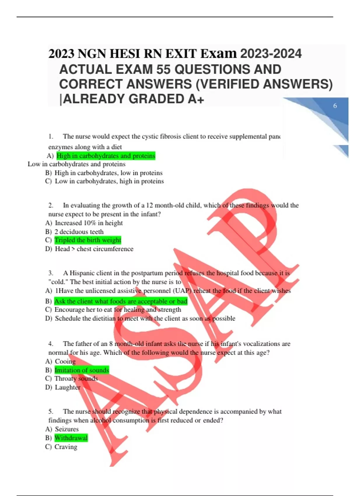 2023 NGN HESI RN EXIT Exam ACTUAL EXAM 55 QUESTIONS AND CORRECT ANSWERS (VERIFIED ANSWERS) |ALREADY GRADED A+ 1. The nurse would expect the cystic fibrosis client to receive supplemental pancreatic enzymes along with a diet A) High in carbohydrates and proteins Low in carbohydrates and proteins B) High in carbohydrates, low in proteins C) Low in carbohydrates, high in proteins 2. In evaluating the growth of a 12 month-old child, which of these findings would the nurse expect to be present in the infant? A) Increased 10% in height B) 2 deciduous teeth C) Tripled the birth weight D) Head chest circumference 3. A Hispanic client in the postpartum period refuses the hospital food because it is "cold." The best initial action by the nurse is to A) 1Have the unlicensed assistive personnel (UAP) reheat the food if the client wishes B) Ask the client what foods are acceptable or bad C) Encourage her to eat for healing and strength D) Schedule the dietitian to meet with the client as soon as possible 4. The father of an 8 month-old infant asks the nurse if his infant's vocalizations are normal for his age. Which of the following would the nurse expect at this age? A) Cooing B) Imitation of sounds C) Throaty sounds D) Laughter 5. The nurse should recognize that physical dependence is accompanied by what findings when alcohol consumption is first reduced or ended? A) Seizures B) Withdrawal C) Craving 7 6 D) Marked tolerance 6. Immediately following an acute battering incident in a violent relationship, the batterer may respond to the partner’s injuries by A) Seeking medical help for the victim's injuries B) Minimizing the episode and underestimating the victim’s injuries C) Contacting a close friend and asking for help D) Being very remorseful and assisting the victim with medical care 7. A client with pneumococcal pneumonia had been started on antibiotics 16 hours ago