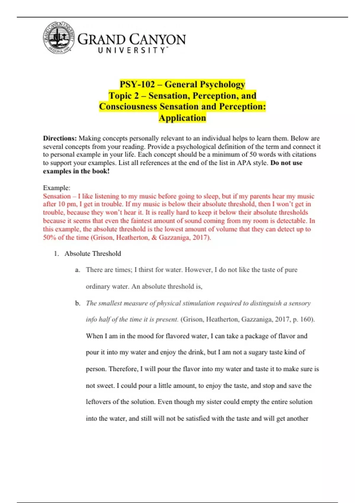 PSY-102 – General Psychology Topic 2 – Sensation, Perception, and Consciousness Sensation and Perception: Application Directions: Making concepts personally relevant to an individual helps to learn them. Below are several concepts from your reading. Provide a psychological definition of the term and connect it to personal example in your life. Each concept should be a minimum of 50 words with citations to support your examples. List all references at the end of the list in APA style. Do not use examples in the book! Example: Sensation – I like listening to my music before going to sleep, but if my parents hear my music after 10 pm, I get in trouble. If my music is below their absolute threshold, then I won’t get in trouble, because they won’t hear it. It is really hard to keep it below their absolute thresholds because it seems that even the faintest amount of sound coming from my room is detectable. In this example, the absolute threshold is the lowest amount of volume that they can detect up to 50% of the time (Grison, Heatherton, & Gazzaniga, 2017). 1. Absolute Threshold a. There are times; I thirst for water. However, I do not like the taste of pure ordinary water. An absolute threshold is, b. The smallest measure of physical stimulation required to distinguish a sensory info half of the time it is present. (Grison, Heatherton, Gazzaniga, 2017, p. 160). When I am in the mood for flavored water, I can take a package of flavor and pour it into my water and enjoy the drink, but I am not a sugary taste kind of person. Therefore, I will pour the flavor into my water and taste it to make sure is not sweet. I could pour a little amount, to enjoy the taste, and stop and save the leftovers of the solution. Even though my sister could empty the entire solution into the water, and still will not be satisfied with the taste and will get another package to make it sweeter. My absolute threshold could be a teaspoon of the flavoring. However, my sister would