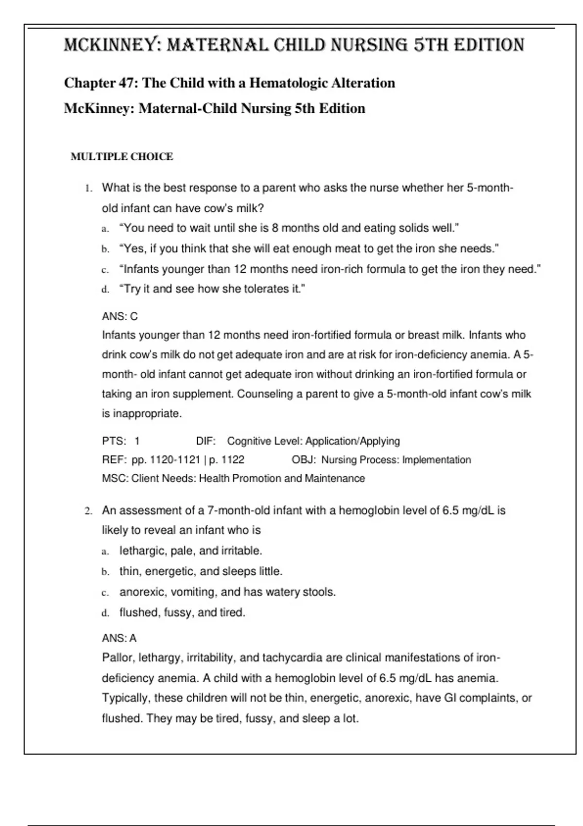 Maternal Child Nursing 5th Edition by McKinney- ISBN- 978-0323401708 TEST BANK Chapter 47: The Child with a Hematologic Alteration Verified 2024 Practice Questions and 100% Correct Answers with Explanations for Exam Preparation, Graded A+ What is the best response to a parent who asks the nurse whether her 5-monthold infant can have cow’s milk? a. “You need to wait until she is 8 months old and eating solids well.” b. “Yes, if you think that she will eat enough meat to get the iron she needs.” c. “Infants younger than 12 months need iron-rich formula to get the iron they need.” d. “Try it and see how she tolerates it.” ANS: C Infants younger than 12 months need iron-fortified formula or breast milk. Infants who drink cow’s milk do not get adequate iron and are at risk for iron-deficiency anemia. A 5- month- old infant cannot get adequate iron without drinking an iron-fortified formula or taking an iron supplement. Counseling a parent to give a 5-month-old infant cow’s milk is inappropriate. PTS: 1 DIF: Cognitive Level: Application/Applying REF: pp. | p. 1122 OBJ: Nursing Process: Implementation MSC: Client Needs: Health Promotion and Maintenance 2. An assessment of a 7-month-old infant with a hemoglobin level of 6.5 mg/dL is likely to reveal an infant who is a. lethargic, pale, and irritable. b. thin, energetic, and sleeps little. c. anorexic, vomiting, and has watery stools. d. flushed, fussy, and tired. ANS: A Pallor, lethargy, irritability, and tachycardia are clinical manifestations of irondeficiency anemia. A child with a hemoglobin level of 6.5 mg/dL has anemia. Typically, these children will not be thin, energetic, anorexic, have GI complaints, or flushed. They may be tired, fussy, and sleep a lot. PTS: 1 DIF: Cognitive Level: Knowledge/Remembering REF: p. 1121 | Parents Want to Know Box OBJ: Nursing Process: Assessment MSC: Client Needs: Physiologic Integrity