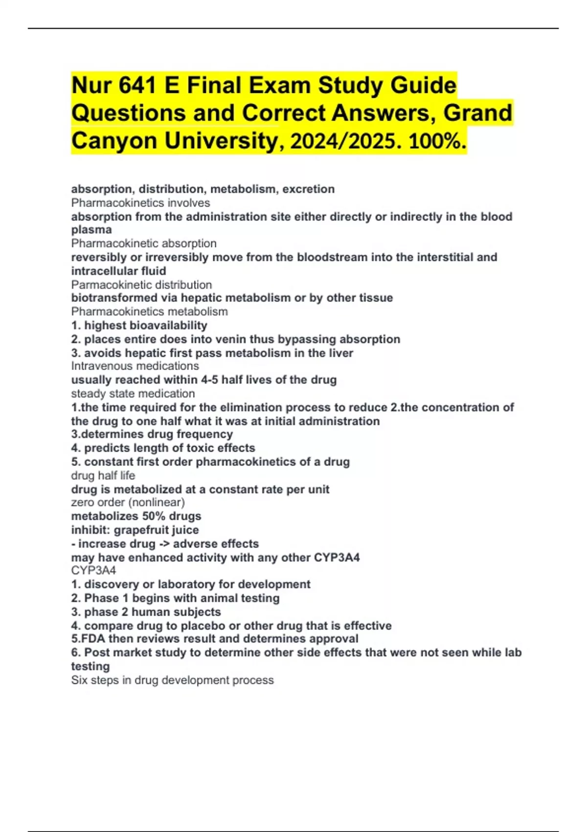 Nur 641 E Final Exam Study Guide Questions and Correct Answers, Grand Canyon University, 2024/2025. 100%. absorption, distribution, metabolism, excretion Pharmacokinetics involves absorption from the administration site either directly or indirectly in the blood plasma Pharmacokinetic absorption reversibly or irreversibly move from the bloodstream into the interstitial and intracellular fluid Parmacokinetic distribution biotransformed via hepatic metabolism or by other tissue Pharmacokinetics metabolism 1. highest bioavailability 2. places entire does into venin thus bypassing absorption 3. avoids hepatic first pass metabolism in the liver Intravenous medications usually reached within 4-5 half lives of the drug steady state medication time required for the elimination process to reduce concentration of the drug to one half what it was at initial administration mines drug frequency 4. predicts length of toxic effects 5. constant first order pharmacokinetics of a drug drug half life drug is metabolized at a constant rate per unit zero order (nonlinear) metabolizes 50% drugs inhibit: grapefruit juice - increase drug - adverse effects may have enhanced activity with any other CYP3A4 CYP3A4 1. discovery or laboratory for development 2. Phase 1 begins with animal testing 3. phase 2 human subjects 4. compare drug to placebo or other drug that is effective 5.FDA then reviews result and determines approval 6. Post market study to determine other side effects that were not seen while lab testing Six steps in drug development process