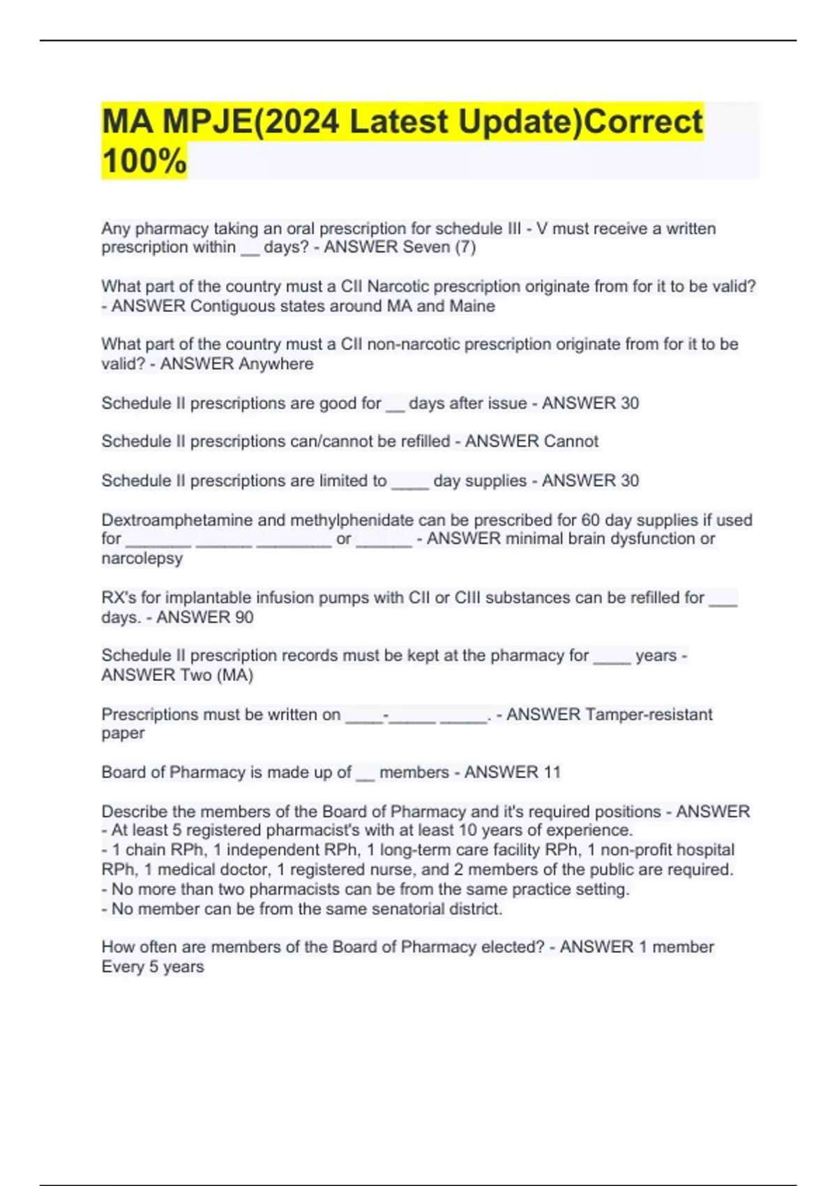 Any pharmacy taking an oral prescription for schedule III - V must receive a written prescription within __ days? - ANSWER Seven (7) What part of the country must a CII Narcotic prescription originate from for it to be valid? - ANSWER Contiguous states around MA and Maine What part of the country must a CII non-narcotic prescription originate from for it to be valid? - ANSWER Anywhere Schedule II prescriptions are good for __ days after issue - ANSWER 30 Schedule II prescriptions can/cannot be refilled - ANSWER Cannot Schedule II prescriptions are limited to ____ day supplies - ANSWER 30 Dextroamphetamine and methylphenidate can be prescribed for 60 day supplies if used for _______ ______ ________ or ______ - ANSWER minimal brain dysfunction or narcolepsy RX's for implantable infusion pumps with CII or CIII substances can be refilled for ___ days. - ANSWER 90 Schedule II prescription records must be kept at the pharmacy for ____ years - ANSWER Two (MA) Prescriptions must be written on ____-_____ _____. - ANSWER Tamper-resistant paper Board of Pharmacy is made up of __ members - ANSWER 11 Describe the members of the Board of Pharmacy and it's required positions - ANSWER - At least 5 registered pharmacist's with at least 10 years of experience. - 1 chain RPh, 1 independent RPh, 1 long-term care facility RPh, 1 non-profit hospital RPh, 1 medical doctor, 1 registered nurse, and 2 members of the public are required. - No more than two pharmacists can be from the same practice setting. - No member can be from the same senatorial district. How often are members of the Board of Pharmacy elected? - ANSWER 1 member Every 5 years When is a new member of the Board of Pharmacy elected - ANSWER November