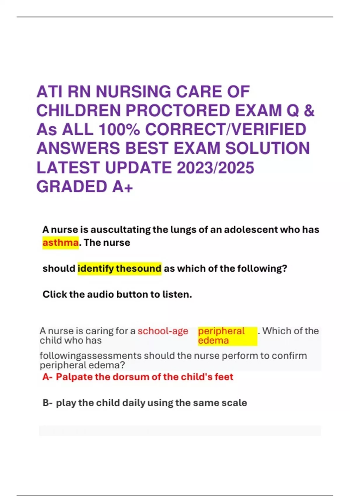 ATI RN NURSING CARE OF CHILDREN PROCTORED EXAM Q & As ALL 100% CORRECT/VERIFIED ANSWERS BEST EXAM SOLUTION LATEST UPDATE 2023/2025 GRADED A+ A nurse is auscultating the lungs of an adolescent who has asthma. The nurse should identify thesound as which of the following? Click the audio button to listen. A nurse is caring for a school-age child who has peripheral edema . Which of the followingassessments should the nurse perform to confirm peripheral edema? A- Palpate the dorsum of the child's feet B- play the child daily using the same scale C- assess the child's skin turgor D- observe the child for periorbital swelling Answer- a A nurse is auscultating the lungs of an adolescent who has asthma. The nurse should identify thesound as which of the following? Click the audio button to listen. Teaching the parents of a school-aged child who has a new diagnosis of osteomyelitis of the tibia. Thenurse should identify that which of the following statements by the parents indicates an