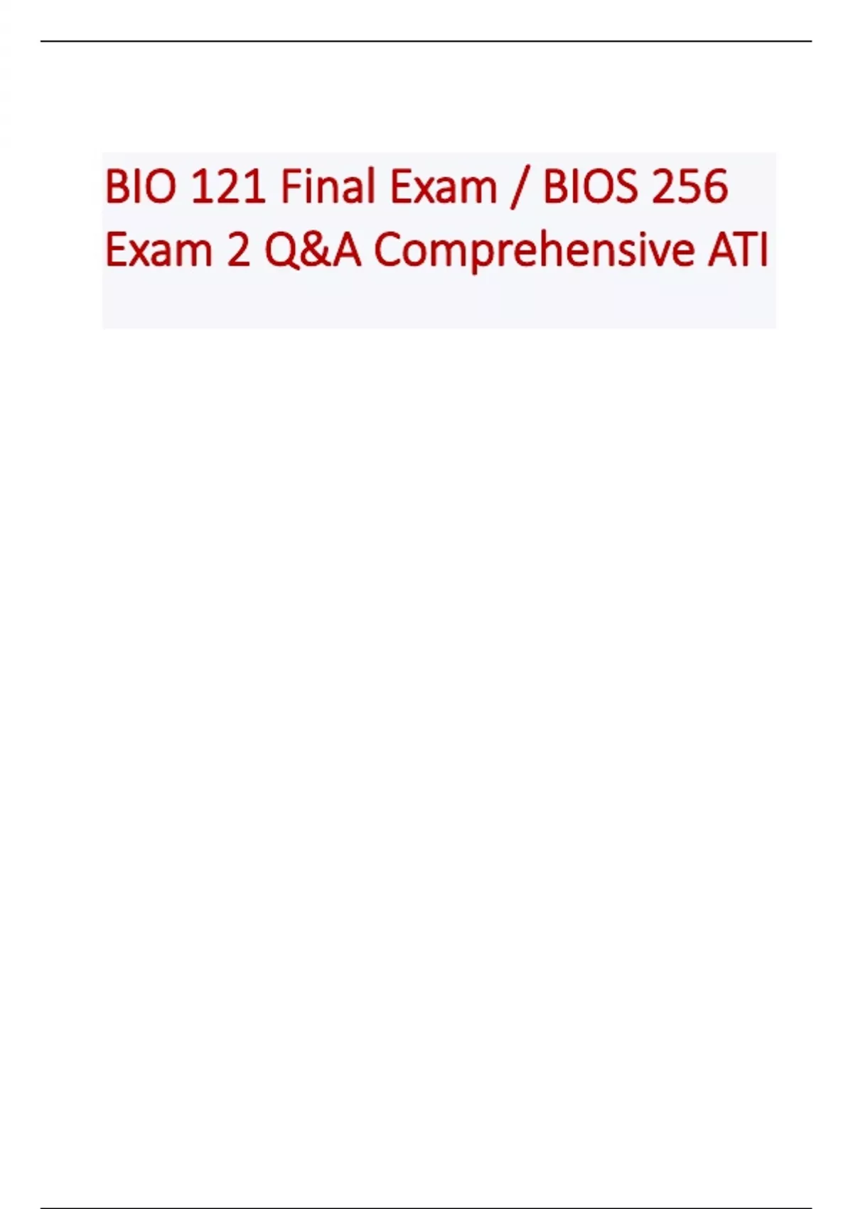 BIO 121 Final Exam / BIOS 256 Exam 2 Q&A Comprehensive ATI What are the 4 characteristics of life? - CORRECT ANSWER-1. Energy 2. Development/Growth 3. Reproduction 4. Population/Evolving What is the difference between Prokaryotic and Eukaryotic Cells? - CORRECT ANSWER-Prokaryotes - NO nucleus Eukaryotes - nucleus and other structures What is the difference between Active and Passive Transport? - CORRECT ANSWER-Active - proteins move against the concentration gradient (L - H) Passive - proteins move with the concentration gradient (H - L) the cell's DNA - CORRECT ANSWERNucleus powerhouse of the cell - CORRECT ANSWER-Mitochondria helps proteins go in/out of the cell - CORRECT ANSWER-Rough Endoplasmic Reticulum assembles membranes and functions in the cell - CORRECT ANSWER-Smooth Endoplasmic Reticulum