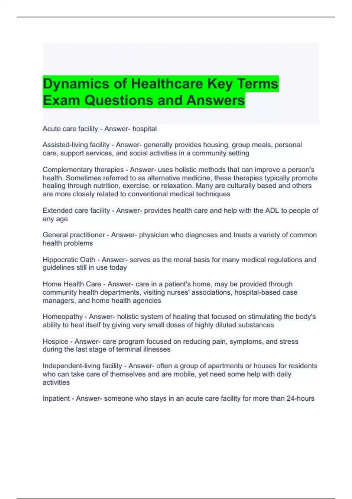Dynamics of Healthcare Key Terms Exam Questions and Answers 2024