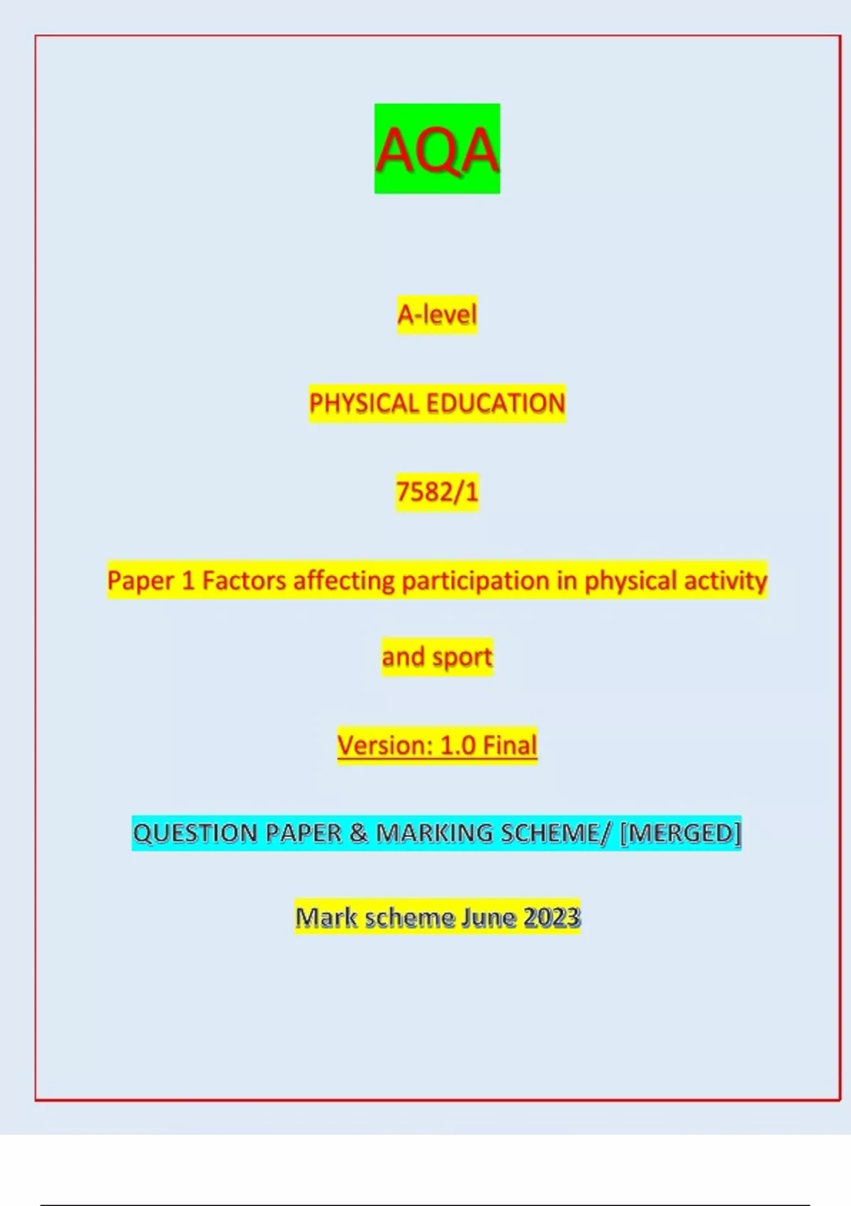 AQA A LEVEL PHYSICAL EDUCATION 7582/1 PAPER 1 FACTORS AFFECTING PARTICIPATION IN PHYSICAL ACTIVITY AND SPORT VERSION 1.0 FINAL QUESTIONS WITH MERGED ANSWERS |JUNE 2023