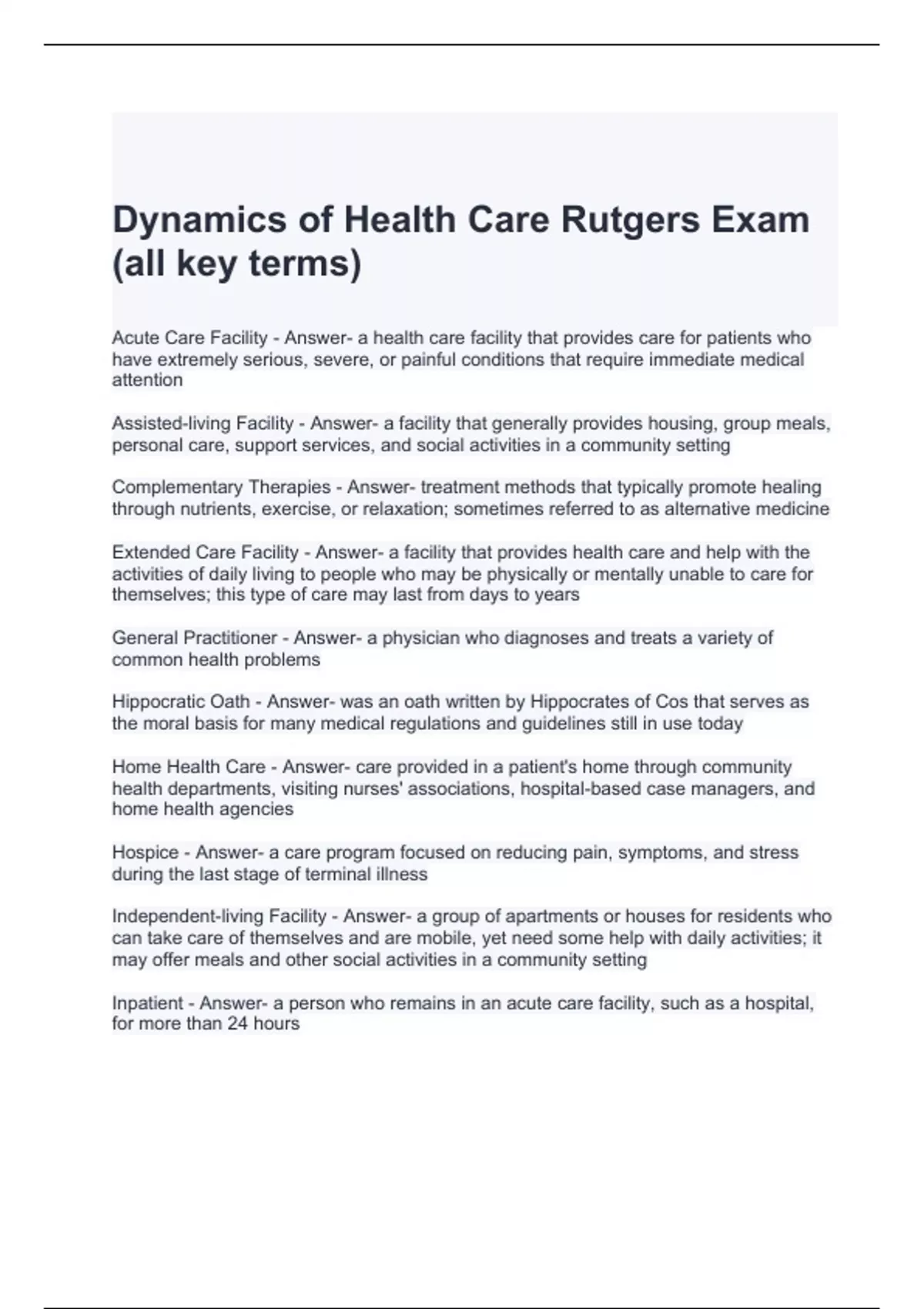 Dynamics of Health Care Rutgers Exam (all key terms) Questions and Answers