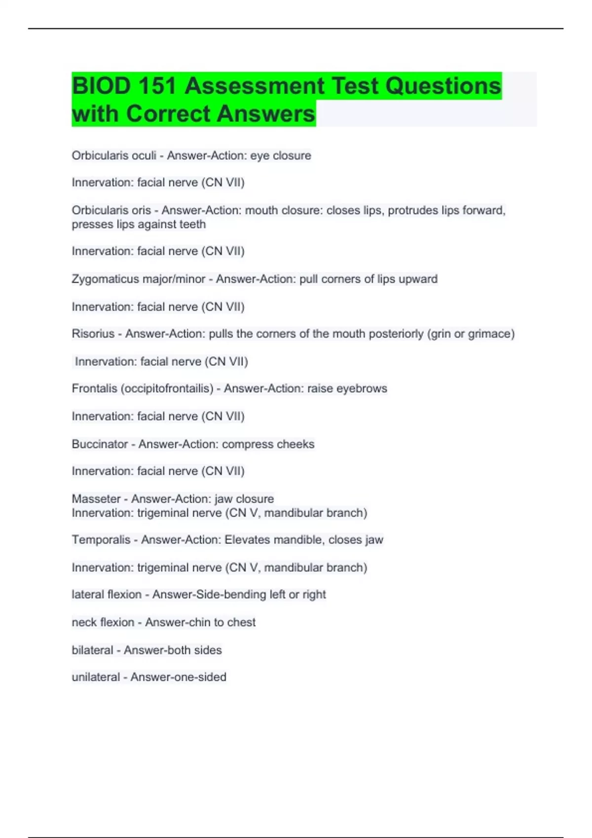 BIOD 151 Assessment Test Questions with Correct Answers Masseter - Answer-Action: jaw closure Innervation: trigeminal nerve (CN V, mandibular branch) Temporalis - Answer-Action: Elevates mandible, closes jaw Innervation: trigeminal nerve (CN V, mandibular branch) lateral flexion - Answer-Side-bending left or right neck flexion - Answer-chin to chest bilateral - Answer-both sides unilateral - Answer-one-sided