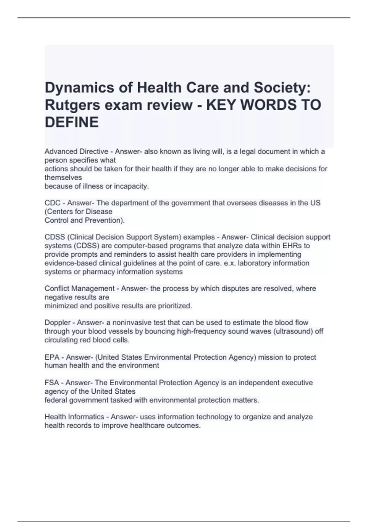 Dynamics of Health Care and Society Rutgers exam review - KEY WORDS TO DEFINE
