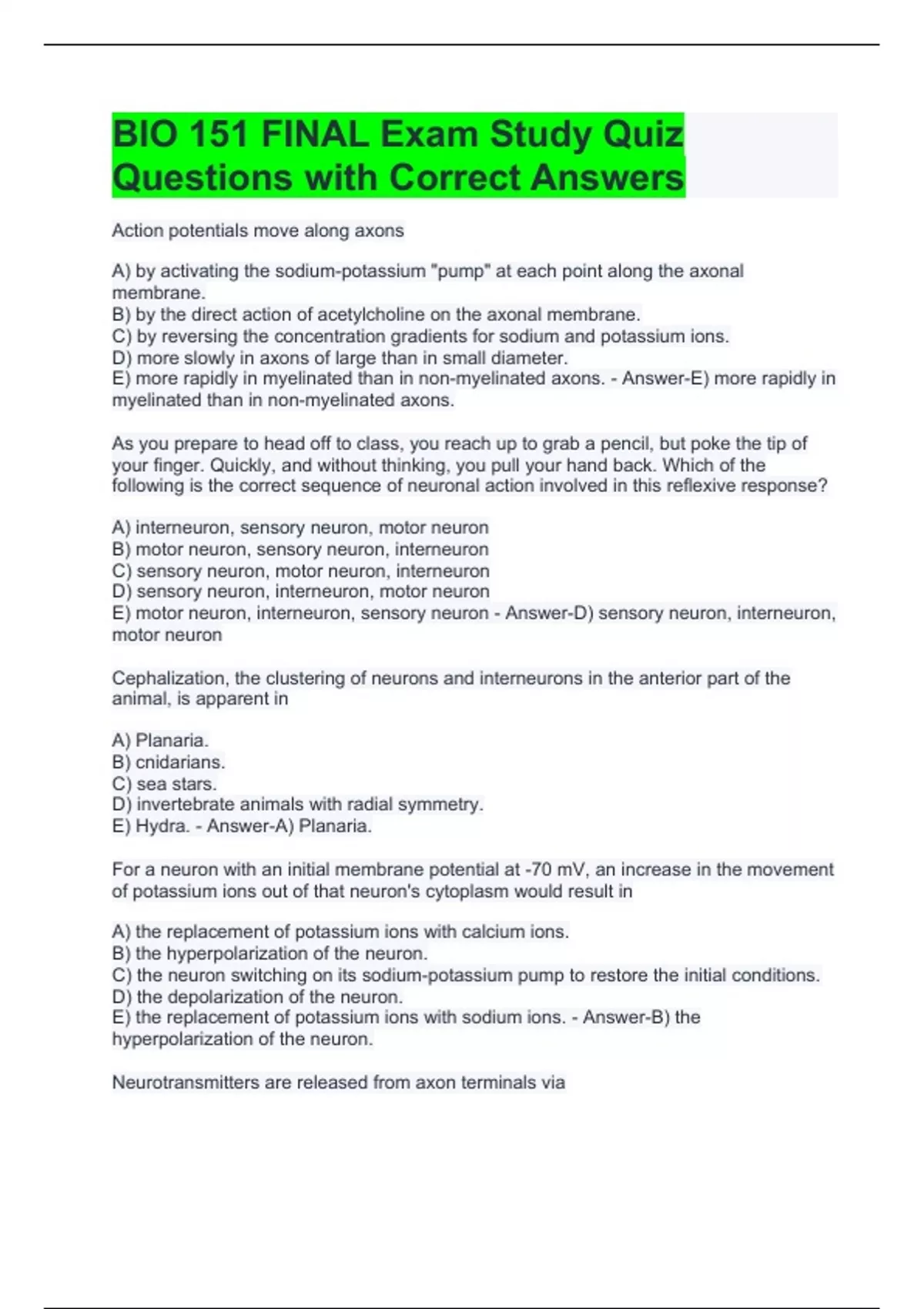 BIO 151 FINAL Exam Study Quiz Questions with Correct Answers A) binding with only one type of neurotransmitter. B) permitting passage by positive but not negative ions. C) permitting passage by negative but not positive ions. D) ability to change its size depending on the ion needing transport. E) permitting passage only to a specific ion. - Answer-E) permitting passage only to a specific ion. The following steps refer to various stages in transmission at a chemical synapse. 1. Neurotransmitter binds with receptors associated with the postsynaptic membrane. 2. Calcium ions rush into neuron's cytoplasm. 3. An action potential depolarizes the membrane of the axon terminal. 4. The ligand-gated ion channels open. 5. The synaptic vesicles release neurotransmitter into the synaptic cleft. Which sequence of events is correct? A) 4 → 3 → 1 → 2 → 5 B) 1 → 2 → 3 → 4 → 5 C) 5 → 1 → 2 → 4 → 3 D) 2 → 3 → 5 → 4 → 1 E) 3 → 2 → 5 → 1 → 4 - Answer-E) 3 → 2 → 5 → 1 → 4 The nucleus and most of the organelles in a neuron are located in the A) axon hillock. B) axon terminals. C) axon. D) dendritic region. E) cell body. - Answer-E) cell body. The operation of the sodium-potassium "pump" moves A) sodium and potassium ions into the mitochondria. B) sodium and potassium ions out of the cell. C) sodium ions out of the cell and potassium ions into the cell. D) sodium ions into the cell and potassium ions out of the cell. E) sodium and potassium ions into the cell. - Answer-C) sodium ions out of the cell and potassium ions into the cell. Two fundamental concepts about the ion channels of a "resting" neuron are that the channels A) are always open, but the concentration gradients of ions frequently change. B) are always closed, but ions move closer to the channels during excitation. C) open and close depending on chemical messengers, and are nonspecific as to which ion can traverse them. D) open in response to stimuli, and then close simultaneously, in unison. E) open and close depending on stimuli, and are specific as to which ion can traverse them. - Answer-E) open and close depending on stimuli, and are specific as to which ion can traverse them.
