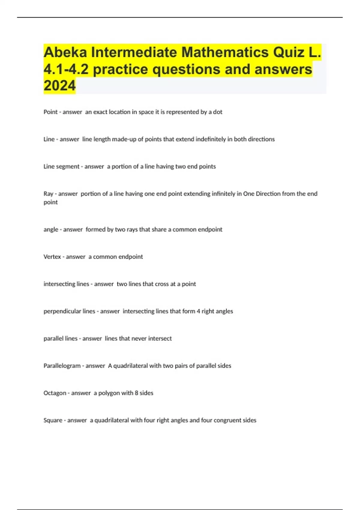 Abeka Intermediate Mathematics Quiz L. 4.1-4.2 practice questions and answers 2024