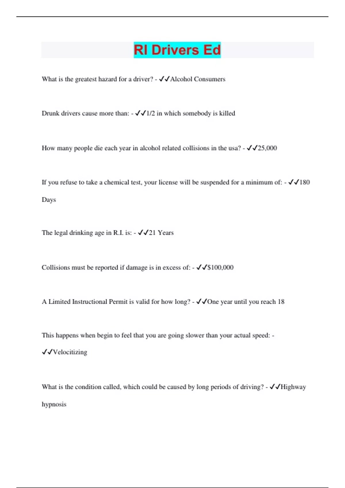 RHODE ISLAND Drivers Education | Questions with 100% Correct Answers | Latest Update 2024 | Verified