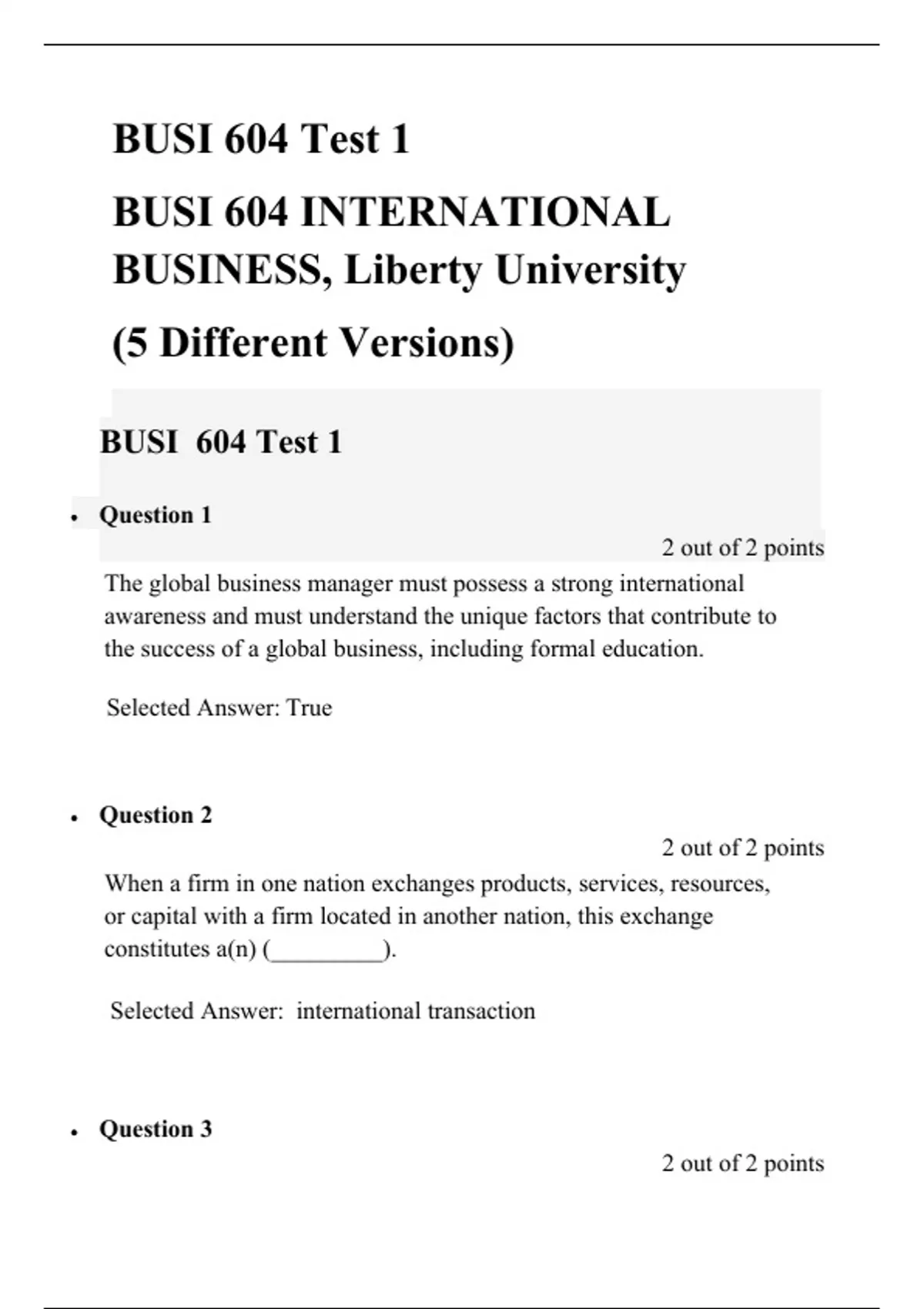 BUSI 604 Test 1 ( 5 Versions), BUSI 604 INTERNATIONAL BUSINESS, Liberty University.