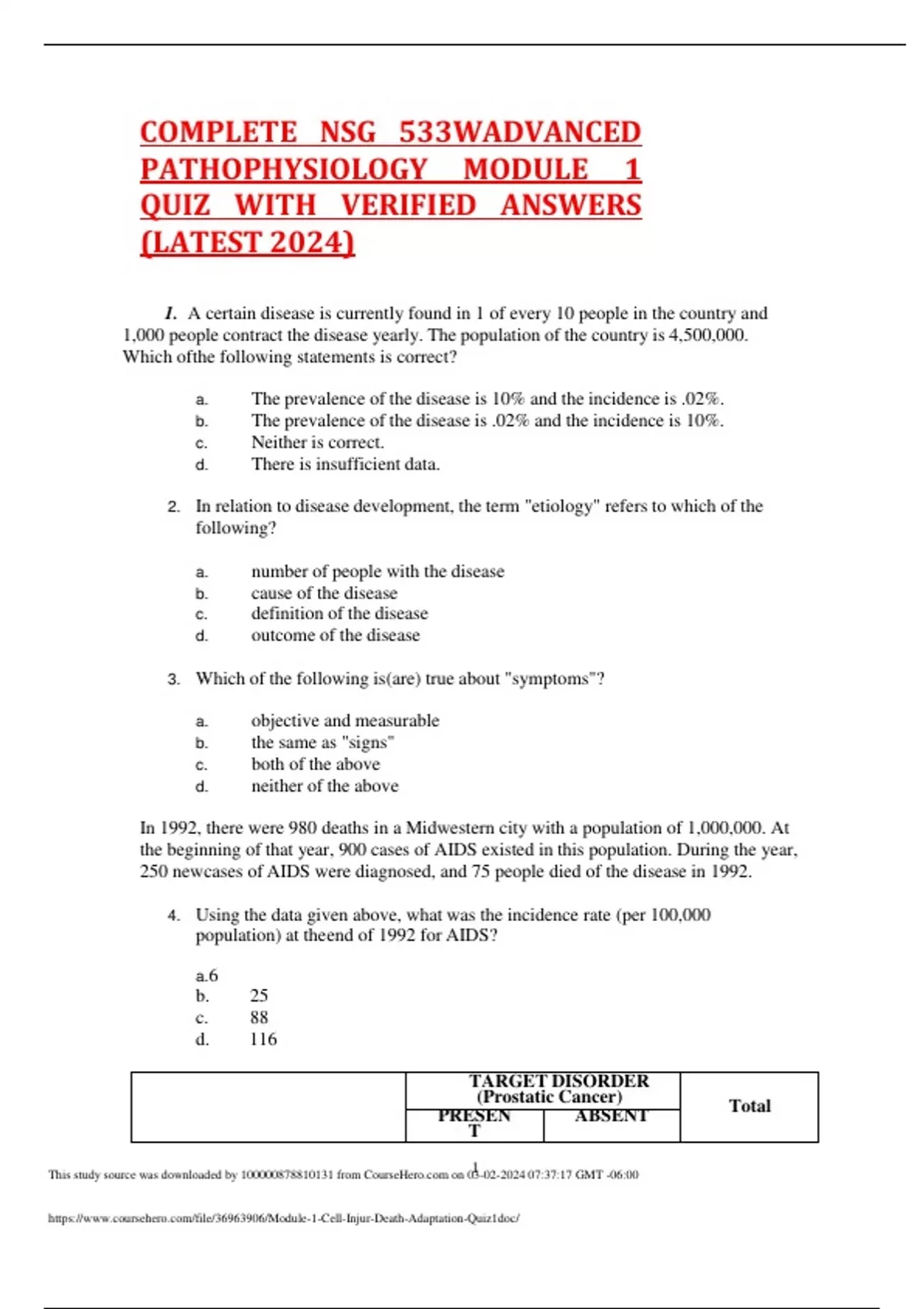 COMPLETE NSG 533WADVANCED PATHOPHYSIOLOGY MODULE 1 QUIZ WITH VERIFIED ANSWERS (LATEST 2024) 1. A certain disease is currently found in 1 of every 10 people in the country and 1,000 people contract the disease yearly. The population of the country is 4,500,000. Which ofthe following statements is correct? a. The prevalence of the disease is 10% and the incidence is .02%. b. The prevalence of the disease is .02% and the incidence is 10%. c. Neither is correct. d. There is insufficient data. 2. In relation to disease development, the term "etiology" refers to which of the following? a. number of people with the disease b. cause of the disease c. definition of the disease d. outcome of the disease 3. Which of the following is(are) true about "symptoms"? a. objective and measurable b. the same as "signs" c. both of the above d. neither of the above In 1992, there were 980 deaths in a Midwestern city with a population of 1,000,000. At the beginning of that year, 900 cases of AIDS existed in this population. During the year, 250 newcases of AIDS were diagnosed, and 75 people died of the disease in 1992. 4. Using the data given above, what was the incidence rate (per 100,000 population) at theend of 1992 for AIDS? a.6 b. 25 c. 88 d. 116 TARGET DISORDER (Prostatic Cancer) Total PRESEN T ABSENT This study source was downloaded by from CourseH on 0 1 :37:17 GMT -06:00 DIAGNOSTIC + (>/=4.5ng/ml) a+b TEST RESULT a b (prostate specific antigen [PSA]) - (<4.5 ng/ml) c+d c