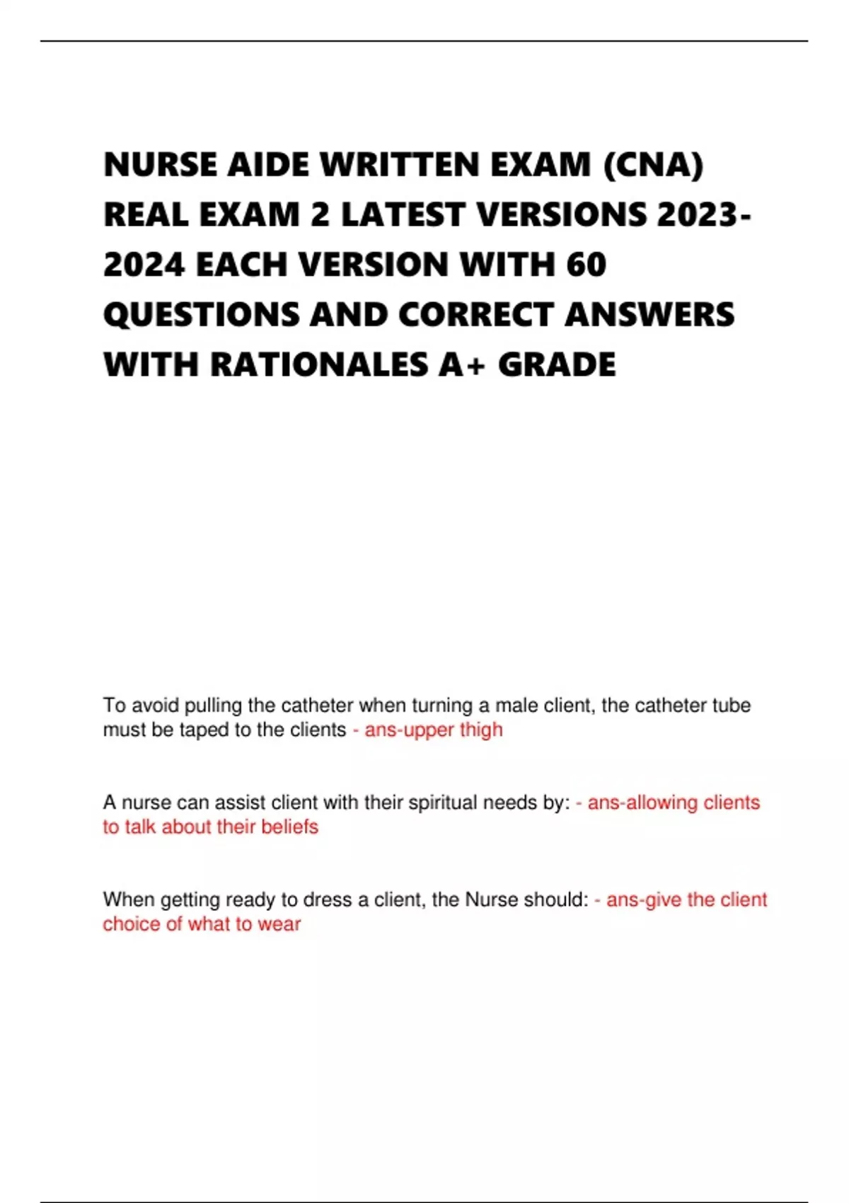 NURSE AIDE WRITTEN EXAM (CNA) REAL EXAM 2 LATEST VERSIONS 2023- 2024 EACH VERSION WITH 60 QUESTIONS AND CORRECT ANSWERS WITH RATIONALES A+ GRADE