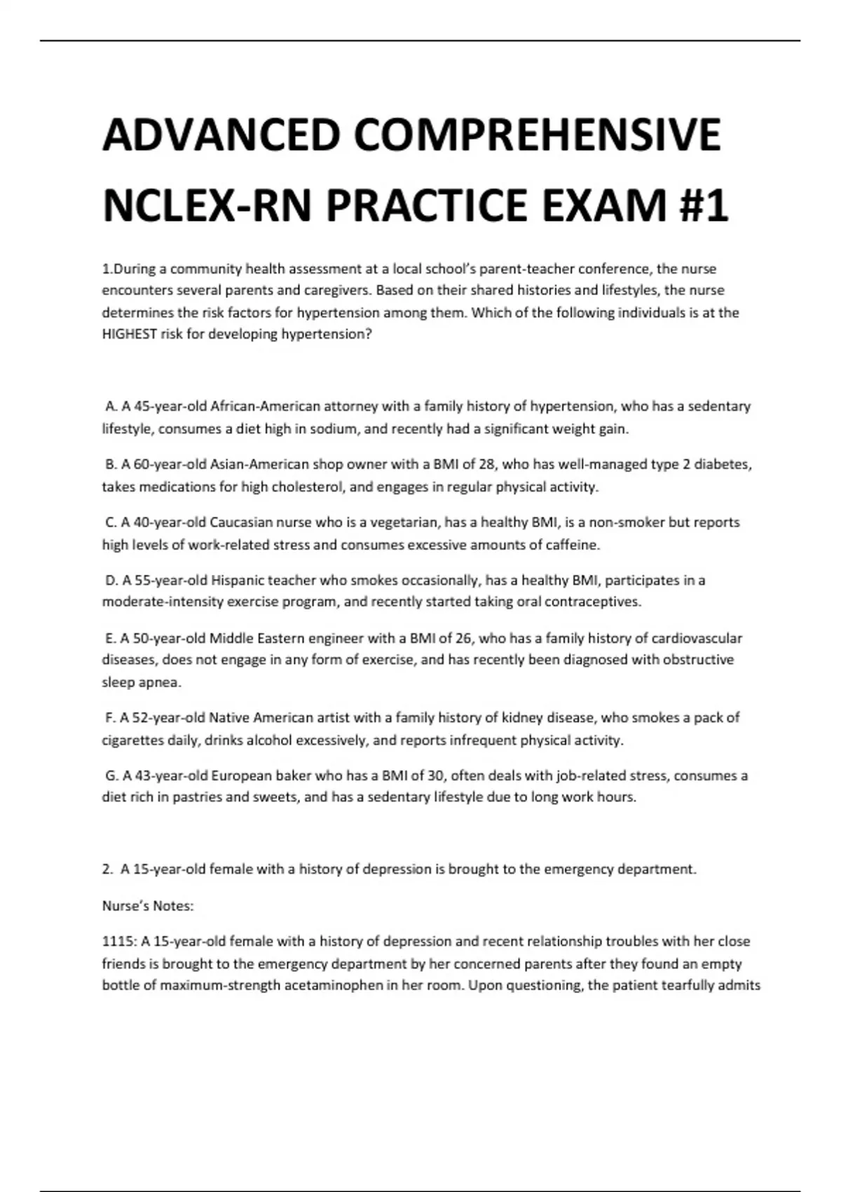 ADVANCED COMPREHENSIVE NCLEX-RN PRACTICE EXAM #1 1.During a community health assessment at a local school’s parent-teacher conference, the nurse encounters several parents and caregivers. Based on their shared histories and lifestyles, the nurse determines the risk factors for hypertension among them. Which of the following individuals is at the HIGHEST risk for developing hypertension? A. A 45-year-old African-American attorney with a family history of hypertension, who has a sedentary lifestyle, consumes a diet high in sodium, and recently had a significant weight gain. B. A 60-year-old Asian-American shop owner with a BMI of 28, who has well-managed type 2 diabetes, takes medications for high cholesterol, and engages in regular physical activity. C. A 40-year-old Caucasian nurse who is a vegetarian, has a healthy BMI, is a non-smoker but reports high levels of work-related stress and consumes excessive amounts of caffeine. D. A 55-year-old Hispanic teacher who smokes occasionally, has a healthy BMI, participates in a moderate-intensity exercise program, and recently started taking oral contraceptives. E. A 50-year-old Middle Eastern engineer with a BMI of 26, who has a family history of cardiovascular diseases, does not engage in any form of exercise, and has recently been diagnosed with obstructive sleep apnea. F. A 52-year-old Native American artist with a family history of kidney disease, who smokes a pack of cigarettes daily, drinks alcohol excessively, and reports infrequent physical activity. G. A 43-year-old European baker who has a BMI of 30, often deals with job-related stress, consumes a diet rich in pastries and sweets, and has a sedentary lifestyle due to long work hours. 2. A 15-year-old female with a history of depression is brought to the emergency department. Nurse’s Notes: 1115: A 15-year-old female with a history of depression and recent relationship troubles with her close friends is brought to the emergency department by her concerned parents after they found an empty bottle of maximum-strength acetaminophen in her room. Upon questioning, the patient tearfully admits to ingesting 15 tablets of the medication 45 minutes ago. She is visibly anxious and frequently looks at the marks on her wrists, which seem to be superficial scratches. Vital signs as of 1115: Blood pressure: 120/70 Heart rate: 88 bpm Respiratory rate: 18 bpm Oxygen saturation: 98% on room air As the nurse prepares to address the situation, several orders from the primary care provider come in. Which of the following orders should the nurse prioritize and carry out first? A. Perform gastric lavage B. Administer acetylcysteine (Mucomyst) orally C. Start an IV with Dextrose 5% and 0.33% normal saline D. Have the patient drink activated charcoal mixed with water E. Conduct a psychiatric evaluation. F. Apply wrist restraints to prevent further self-harm. 3. A 68-year-old male with a history of hypertension and diabetes has undergone a cardiac catheterization to evaluate potential coronary artery disease. He has a known allergy to iodine-based contrast agents, which required premedication with corticosteroids and antihistamines. The procedure was successful, but the patient experienced brief hypotension during the administration of the contrast material. The patient has been transferred to the cardiac step-down unit for observation, and the nurse is aware of the potential complications that can arise in the initial 24 hours post-procedure. Which complication should the nurse monitor closely during this period? A. Persistent angina despite being at rest and receiving nitroglycerin B. Thrombus formation leading to decreased peripheral pulses and cyanosis
