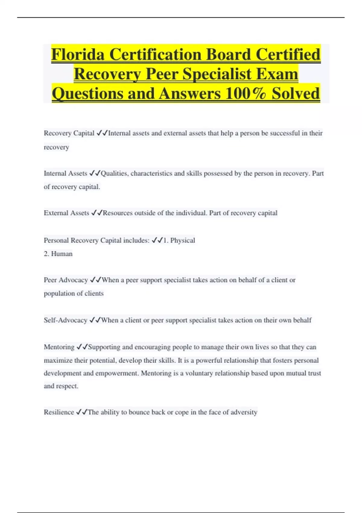 Florida Certification Board Certified Recovery Peer Specialist Exam Questions and Answers 100% Solved Recovery Capital Internal assets and external assets that help a person be successful in their recovery Internal Assets Qualities, characteristics and skills possessed by the person in recovery. Part of recovery capital. External Assets Resources outside of the individual. Part of recovery capital Personal Recovery Capital includes: 1. Physical 2. Human Peer Advocacy When a peer support specialist takes action on behalf of a client or population of clients Self-Advocacy When a client or peer support specialist takes action on their own behalf Mentoring Supporting and encouraging people to manage their own lives so that they can maximize their potential, develop their skills. It is a powerful relationship that fosters personal development and empowerment. Mentoring is a voluntary relationship based upon mutual trust and respect. Resilience The ability to bounce back or cope in the face of adversity