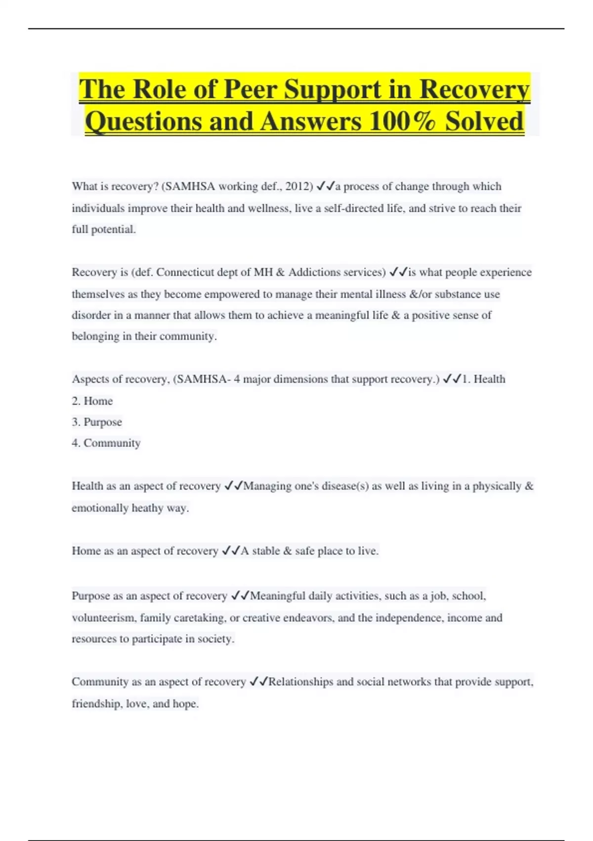 The Role of Peer Support in Recovery Questions and Answers 100% Solved What is recovery? (SAMHSA working def., 2012) a process of change through which individuals improve their health and wellness, live a self-directed life, and strive to reach their full potential. Recovery is (def. Connecticut dept of MH & Addictions services) is what people experience themselves as they become empowered to manage their mental illness &/or substance use disorder in a manner that allows them to achieve a meaningful life & a positive sense of belonging in their community. Aspects of recovery, (SAMHSA- 4 major dimensions that support recovery.) 1. Health 2. Home 3. Purpose 4. Community Health as an aspect of recovery Managing one's disease(s) as well as living in a physically & emotionally heathy way. Home as an aspect of recovery A stable & safe place to live. Purpose as an aspect of recovery Meaningful daily activities, such as a job, school, volunteerism, family caretaking, or creative endeavors, and the independence, income and resources to participate in society. Community as an aspect of recovery Relationships and social networks that provide support, friendship, love, and hope.
