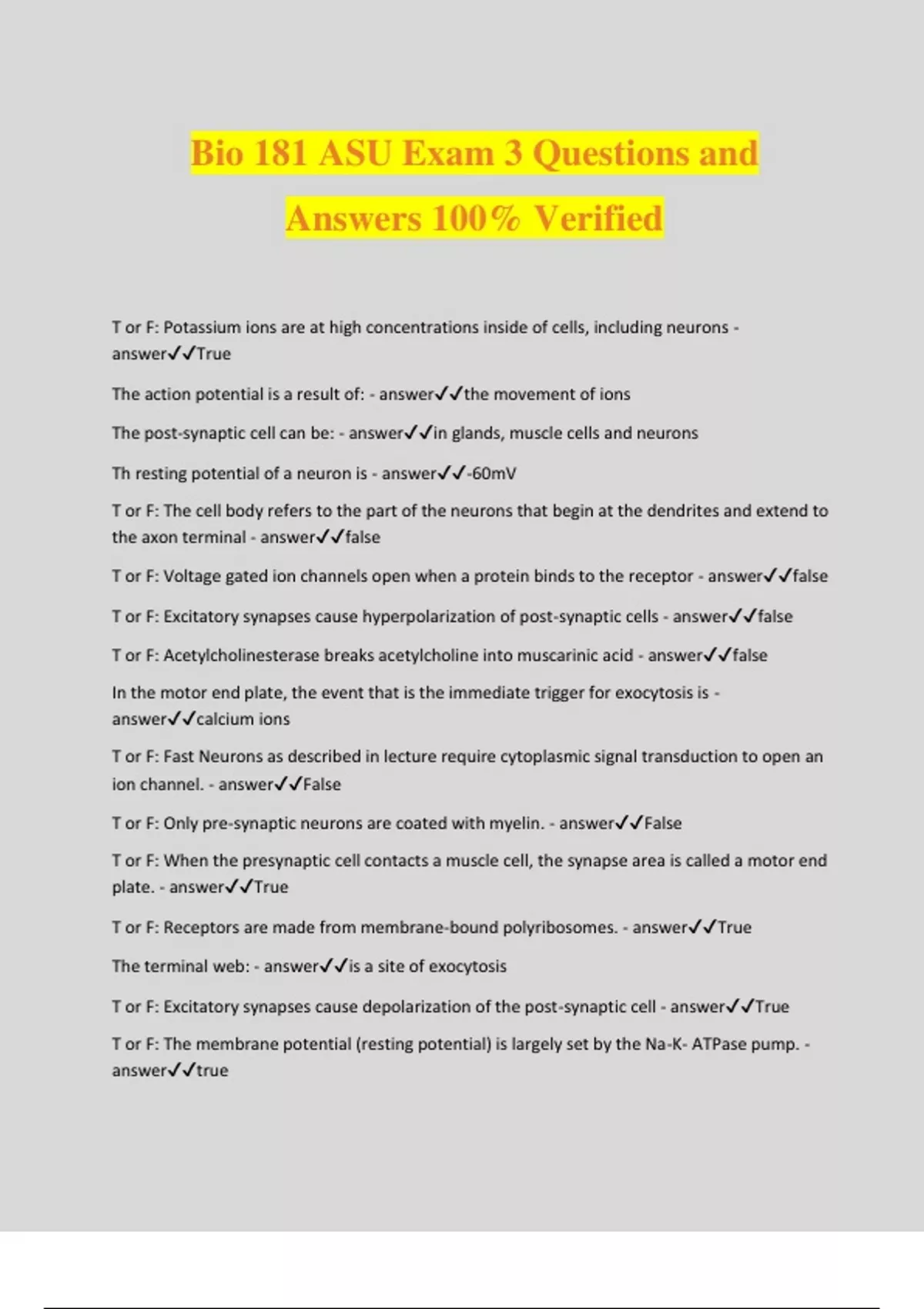 Bio 181 ASU Exam 3 Questions and Answers 100% Verified T or F: Potassium ions are at high concentrations inside of cells, including neurons - answerTrue The action potential is a result of: - answerthe movement of ions The post-synaptic cell can be: - answerin glands, muscle cells and neurons Th resting potential of a neuron is - answer-60mV T or F: The cell body refers to the part of the neurons that begin at the dendrites and extend to the axon terminal - answerfalse T or F: Voltage gated ion channels open when a protein binds to the receptor - answerfalse T or F: Excitatory synapses cause hyperpolarization of post-synaptic cells - answerfalse T or F: Acetylcholinesterase breaks acetylcholine into muscarinic acid - answerfalse In the motor end plate, the event that is the immediate trigger for exocytosis is - answercalcium ions T or F: Fast Neurons as described in lecture require cytoplasmic signal transduction to open an ion channel. - answerFalse T or F: Only pre-synaptic neurons are coated with myelin. - answerFalse T or F: When the presynaptic cell contacts a muscle cell, the synapse area is called a motor end plate. - answerTrue T or F: Receptors are made from membrane-bound polyribosomes. - answerTrue The terminal web: - answeris a site of exocytosis T or F: Excitatory synapses cause depolarization of the post-synaptic cell - answerTrue T or F: The membrane potential (resting potential) is largely set by the Na-K- ATPase pump. - answertrue