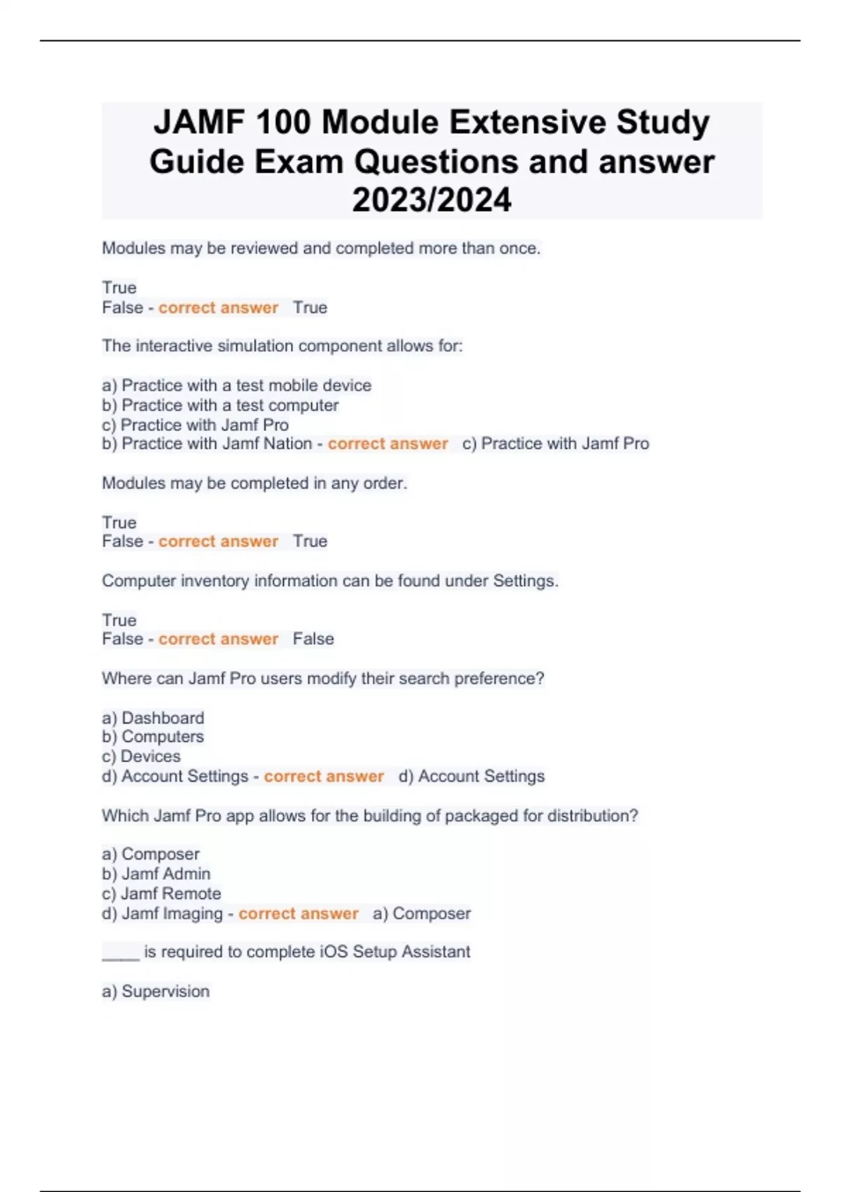 JAMF 100 Module Extensive Study Guide Exam Questions and answer 2023/2024 Modules may be reviewed and completed more than once. True False - correct answer True The interactive simulation component allows for: a) Practice with a test mobile device b) Practice with a test computer c) Practice with Jamf Pro b) Practice with Jamf Nation - correct answer c) Practice with Jamf Pro Modules may be completed in any order. True False - correct answer True Computer inventory information can be found under Settings. True False - correct answer False Where can Jamf Pro users modify their search preference? a) Dashboard b) Computers c) Devices d) Account Settings - correct answer d) Account Settings Which Jamf Pro app allows for the building of packaged for distribution? a) Composer b) Jamf Admin c) Jamf Remote d) Jamf Imaging - correct answer a) Composer ____ is required to complete iOS Setup Assistant a) Supervision b) Apple ID c) Activation d) Automated Device Enrollment - correct answer c) Activation The _____ app contains detailed information about an iOS device a) Tips b) Settings c) Mail d) Photos - correct answer b) Settings To delete an app from an iOS device: a) Tap and hold the app until a menu pops up and tap "Delete App". b) Navigate to Settings > General > App list c) Secondary click on the app and click "Remove". d) Apps cannot be deleted on iOS devices. - correct answer a) Tap and hold the app until a menu pops up and tap "Delete App". The name of an iOS device can be found by navigating to Settings > General > _____. a) Device Name b) Accessibility c) About d) Reset - correct answer c) About When downloading a paid app from the App Store, what will the download button say? a) GET b) BUY c) PAID d) The price of the app - correct answer d) The price of the app By default, iOS devices require that a passcode is always set. True False - correct answer False You can opt out of sending activity and crash data to app developers through iOS Setup Assistant. True False - correct answer True