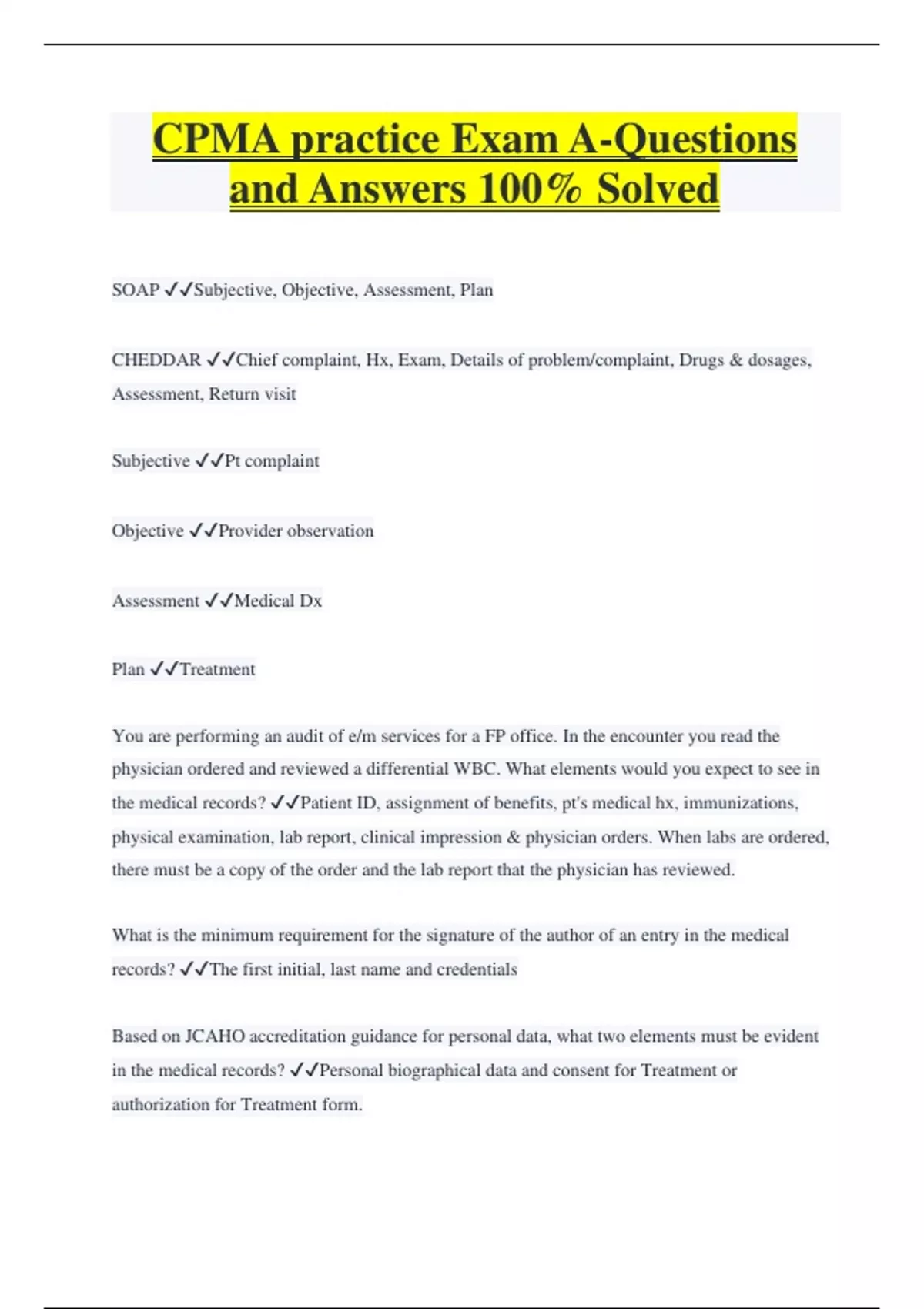 CPMA practice Exam A-Questions and Answers 100% Solved SOAP Subjective, Objective, Assessment, Plan CHEDDAR Chief complaint, Hx, Exam, Details of problem/complaint, Drugs & dosages, Assessment, Return visit Subjective Pt complaint Objective Provider observation Assessment Medical Dx Plan Treatment You are performing an audit of e/m services for a FP office. In the encounter you read the physician ordered and reviewed a differential WBC. What elements would you expect to see in the medical records? Patient ID, assignment of benefits, pt's medical hx, immunizations, physical examination, lab report, clinical impression & physician orders. When labs are ordered, there must be a copy of the order and the lab report that the physician has reviewed. What is the minimum requirement for the signature of the author of an entry in the medical records? The first initial, last name and credentials