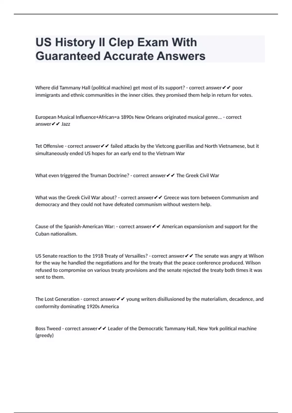 US History II Clep Exam With Guaranteed Accurate Answers