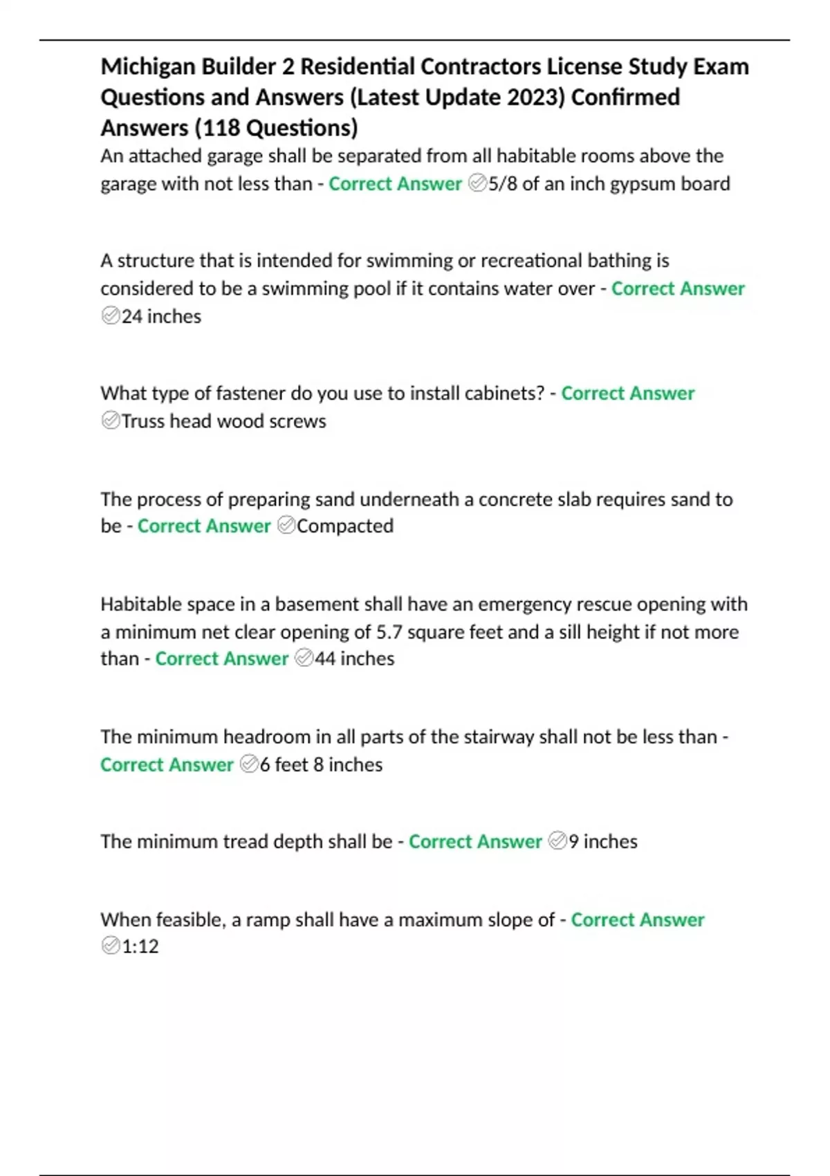 Michigan Builder 2 Residential Contractors License Study Exam Questions and Answers (Latest Update 2023) Confirmed Answers (118 Questions)