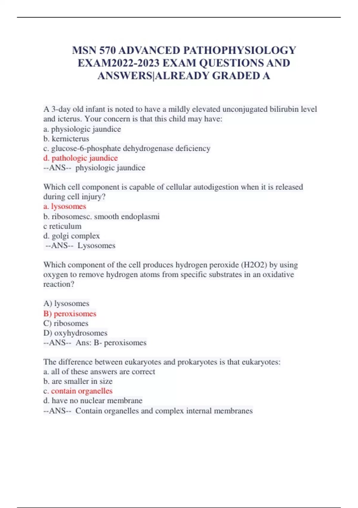 MSN 570 ADVANCED PATHOPHYSIOLOGY EXAM EXAM QUESTIONS AND ANSWERS|ALREADY GRADED A A 3-day old infant is noted to have a mildly elevated unconjugated bilirubin level and icterus. Your concern is that this child may have: a. physiologic jaundice b. kernicterus c. glucose-6-phosphate dehydrogenase deficiency d. pathologic jaundice --ANS-- physiologic jaundice Which cell component is capable of cellular autodigestion when it is released during cell injury? a. lysosomes b. ribosomesc. smooth endoplasmi c reticulum d. golgi complex --ANS-- Lysosomes Which component of the cell produces hydrogen peroxide (H2O2) by using oxygen to remove hydrogen atoms from specific substrates in an oxidative reaction? A) lysosomes B) peroxisomes C) ribosomes D) oxyhydrosomes --ANS-- Ans: B- peroxisomes The difference between eukaryotes and prokaryotes is that eukaryotes: a. all of these answers are correct b. are smaller in size c. contain organelles d. have no nuclear membrane --ANS-- Contain organelles and complex internal membranes