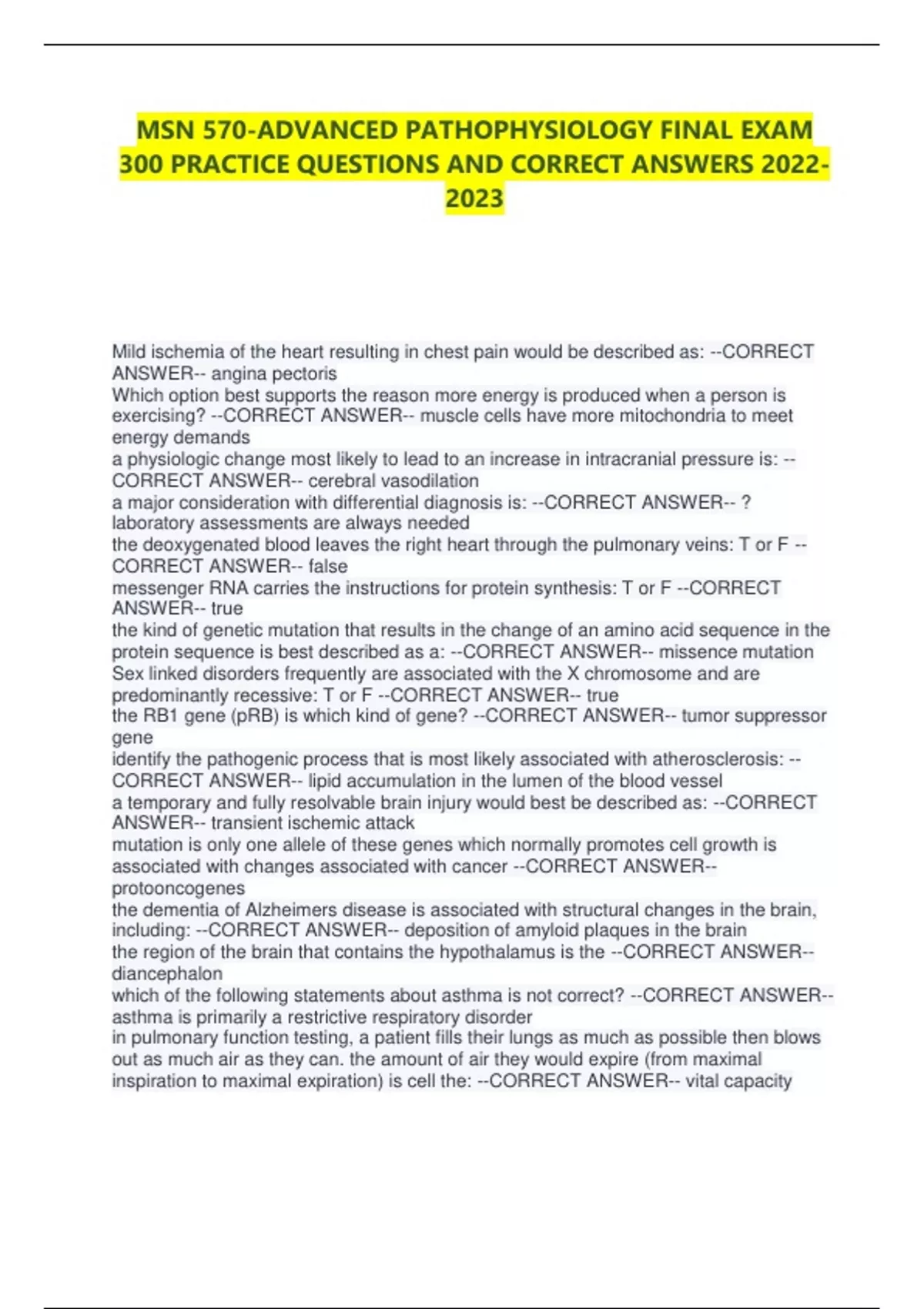 MSN 570-ADVANCED PATHOPHYSIOLOGY FINAL EXAM 300 PRACTICE QUESTIONS AND CORRECT ANSWERS 2022- 2023 Mild ischemia of the heart resulting in chest pain would be described as: --CORRECT ANSWER-- angina pectoris Which option best supports the reason more energy is produced when a person is exercising? --CORRECT ANSWER-- muscle cells have more mitochondria to meet energy demands a physiologic change most likely to lead to an increase in intracranial pressure is: -- CORRECT ANSWER-- cerebral vasodilation a major consideration with differential diagnosis is: --CORRECT ANSWER-- ? laboratory assessments are always needed the deoxygenated blood leaves the right heart through the pulmonary veins: T or F -- CORRECT ANSWER-- false messenger RNA carries the instructions for protein synthesis: T or F --CORRECT ANSWER-- true the kind of genetic mutation that results in the change of an amino acid sequence in the protein sequence is best described as a: --CORRECT ANSWER-- missence mutation Sex linked disorders frequently are associated with the X chromosome and are predominantly recessive: T or F --CORRECT ANSWER-- true the RB1 gene (pRB) is which kind of gene? --CORRECT ANSWER-- tumor suppressor gene identify the pathogenic process that is most likely associated with atherosclerosis: -- CORRECT ANSWER-- lipid accumulation in the lumen of the blood vessel a temporary and fully resolvable brain injury would best be described as: --CORRECT ANSWER-- transient ischemic attack mutation is only one allele of these genes which normally promotes cell growth is associated with changes associated with cancer --CORRECT ANSWER-- protooncogenes the dementia of Alzheimers disease is associated with structural changes in the brain, including: --CORRECT ANSWER-- deposition of amyloid plaques in the brain the region of the brain that contains the hypothalamus is the --CORRECT ANSWER-- diancephalon which of the following statements about asthma is not correct? --CORRECT ANSWER-- asthma is primarily a restrictive respiratory disorder in pulmonary function testing, a patient fills their lungs as much as possible then blows out as much air as they can. the amount of air they would expire (from maximal inspiration to maximal expiration) is cell the: --CORRECT ANSWER-- vital capacity