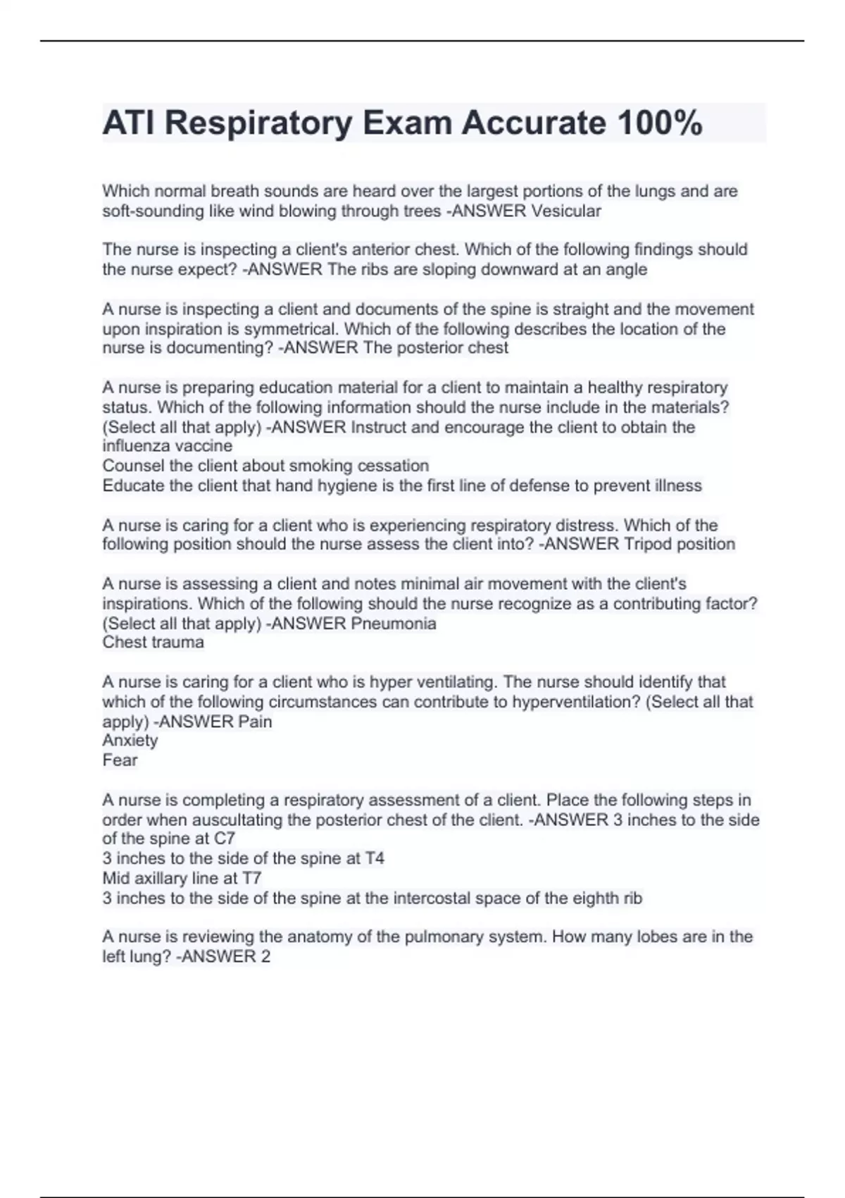 Which normal breath sounds are heard over the largest portions of the lungs and are soft-sounding like wind blowing through trees -ANSWER Vesicular The nurse is inspecting a client's anterior chest. Which of the following findings should the nurse expect? -ANSWER The ribs are sloping downward at an angle A nurse is inspecting a client and documents of the spine is straight and the movement upon inspiration is symmetrical. Which of the following describes the location of the nurse is documenting? -ANSWER The posterior chest A nurse is preparing education material for a client to maintain a healthy respiratory status. Which of the following information should the nurse include in the materials? (Select all that apply) -ANSWER Instruct and encourage the client to obtain the influenza vaccine Counsel the client about smoking cessation Educate the client that hand hygiene is the first line of defense to prevent illness A nurse is caring for a client who is experiencing respiratory distress. Which of the following position should the