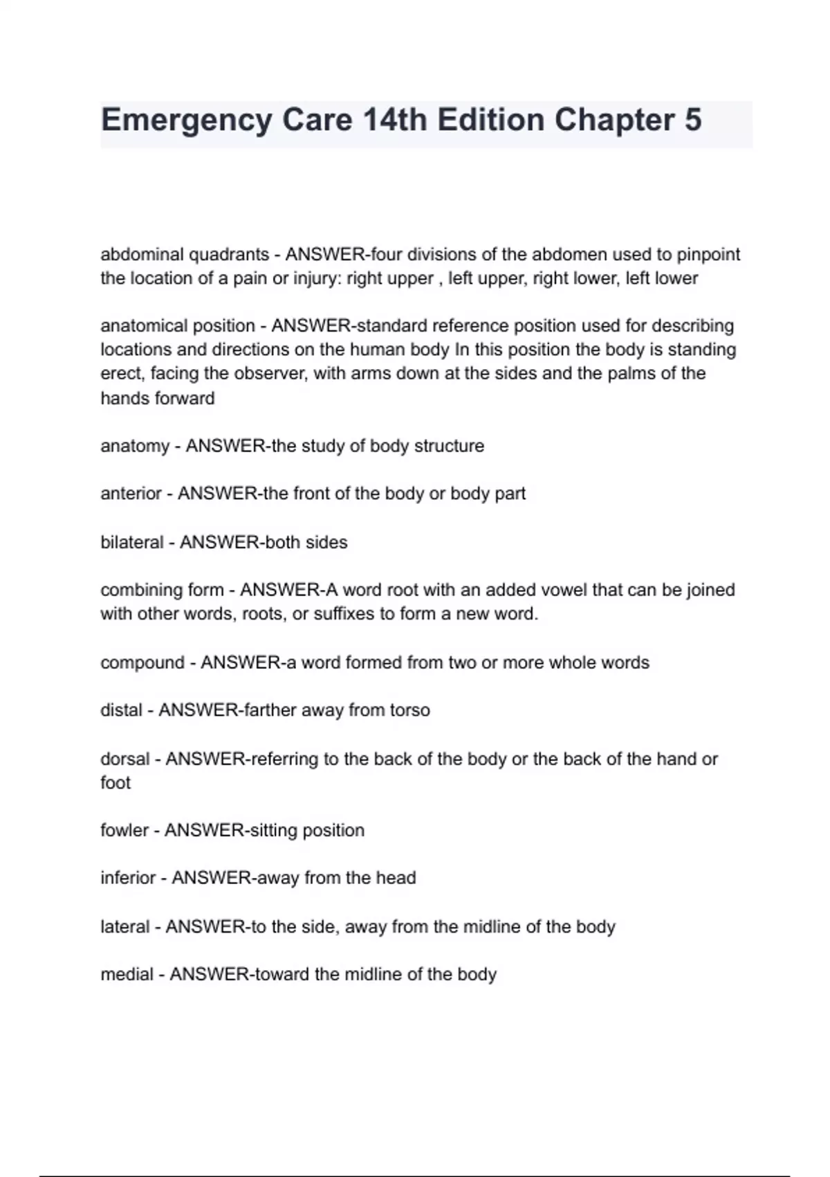 abdominal quadrants - ANSWER-four divisions of the abdomen used to pinpoint the location of a pain or injury: right upper , left upper, right lower, left lower anatomical position - ANSWER-standard reference position used for describing locations and directions on the human body In this position the body is standing erect, facing the observer, with arms down at the sides and the palms of the hands forward anatomy - ANSWER-the study of body structure anterior - ANSWER-the front of the body or body part bilateral - ANSWER-both sides combining form - ANSWER-A word root with an added vowel that can be joined with other words, roots, or suffixes to form a new word. compound - ANSWER-a word formed from two or more whole words distal - ANSWER-farther away from torso dorsal - ANSWER-referring to the back of the body or the back of the hand or foot fowler - ANSWER-sitting position inferior - ANSWER-away from the head lateral - ANSWER-to th