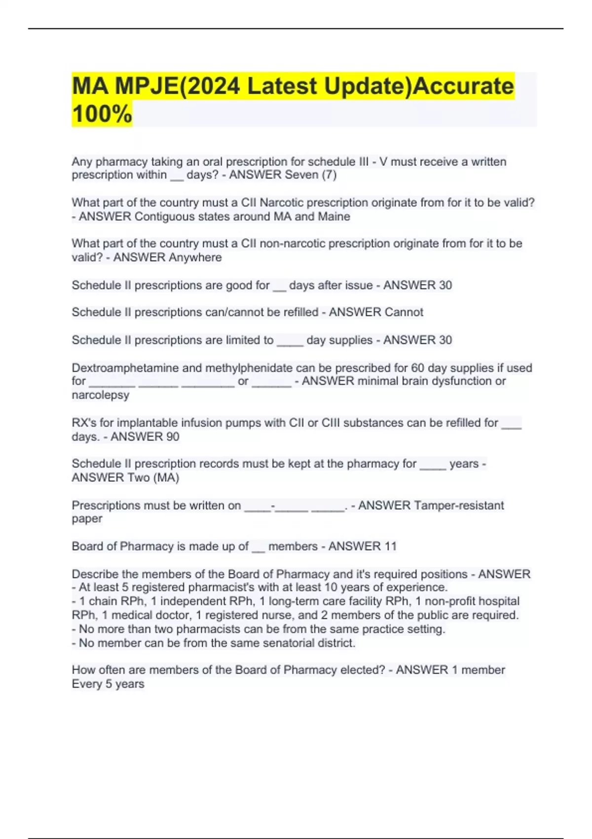 MA MPJE(2024 Latest Update)Accurate 100% Any pharmacy taking an oral prescription for schedule III - V must receive a written prescription within __ days? - ANSWER Seven (7) What part of the country must a CII Narcotic prescription originate from for it to be valid? - ANSWER Contiguous states around MA and Maine What part of the country must a CII non-narcotic prescription originate from for it to be valid? - ANSWER Anywhere Schedule II prescriptions are good for __ days after issue - ANSWER 30 Schedule II prescriptions can/cannot be refilled - ANSWER Cannot Schedule II prescriptions are limited to ____ day supplies - ANSWER 30 Dextroamphetamine and methylphenidate can be prescribed for 60 day supplies if used for _______ ______ ________ or ______ - ANSWER minimal brain dysfunction or narcolepsy RX's for implantable infusion pumps with CII or CIII substances can be refilled for ___ days. - ANSWER 90 Schedule II prescription records must be kept at the pharmacy for ____ years - ANSWER Two (MA) Prescriptions must be written on ____-_____ _____. - ANSWER Tamper-resistant paper Board of Pharmacy is made up of __ members - ANSWER 11 Describe the members of the Board of Pharmacy and it's required positions - ANSWER - At least 5 registered pharmacist's with at least 10 years of experience. - 1 chain RPh, 1 independent RPh, 1 long-term care facility RPh, 1 non-profit hospital RPh, 1 medical doctor, 1 registered nurse, and 2 members of the public are required. - No more than two pharmacists can be from the same practice setting. - No member can be from the same senatorial district. How often are members of the Board of Pharmacy elected? - ANSWER 1 member Every 5 years When is a new member of the Board of Pharmacy elected - ANSWER November Who elects a new member of the Board of Pharmacy - ANSWER Governor The Board of Pharmacy meets the ____ ______ of every ____ to elect a secretary and president. How long will they serve under those positions? - ANSWER First tuesday of every December. 1 year The Board of Pharmacy also hold annual meetings on the ____ _______ of _______,_______, and ______. - ANSWER First tuesday of January, May, and October How much does the Secretary of the Board earn a year? (2013) - ANSWER $2250 plus traveling expenses to and from board meetings How much do members of the Board of Pharmacy earn a year? (2013) - ANSWER $1050 plus traveling expenses to and from board meetings The Board of Pharmacy appoints __(number)___ agents who will inspect all drug establishments. These agents will also file criminal complaints on behalf of the board. - ANSWER Six (6) Pharmacist Registrations expire on ______, of ___-numbered years. - ANSWER December 31st of even-numbered years CDTM can only be performed in these locations - ANSWER Hospitals LTCF's In- and Out-patient hospice Ambulatory Care facilities Retail Pharmacies To be eligible to participate in CDTM, a pharmacist must: - ANSWER - Be currently registered - Have at least $1,000,000 in liability insurance - Have a PharmD or at least 5 years experience - Devote part of the pharmacy to a drug therapy area - Participate in 5 extra CE hours (0.5 CEUs) that address areas of practice generally related to the particular collaborative practice agreement CDTM agreement must be limited to: - ANSWER - Patients 18 years or older - 30 day-extension of medication with the same directions as prescribed by the practitioner (for not more than two 30 day periods) - Administration of Vaccines - Initiations, discontinuations, or modifications of dosages for asthma, COPD, DM, HTN, hype