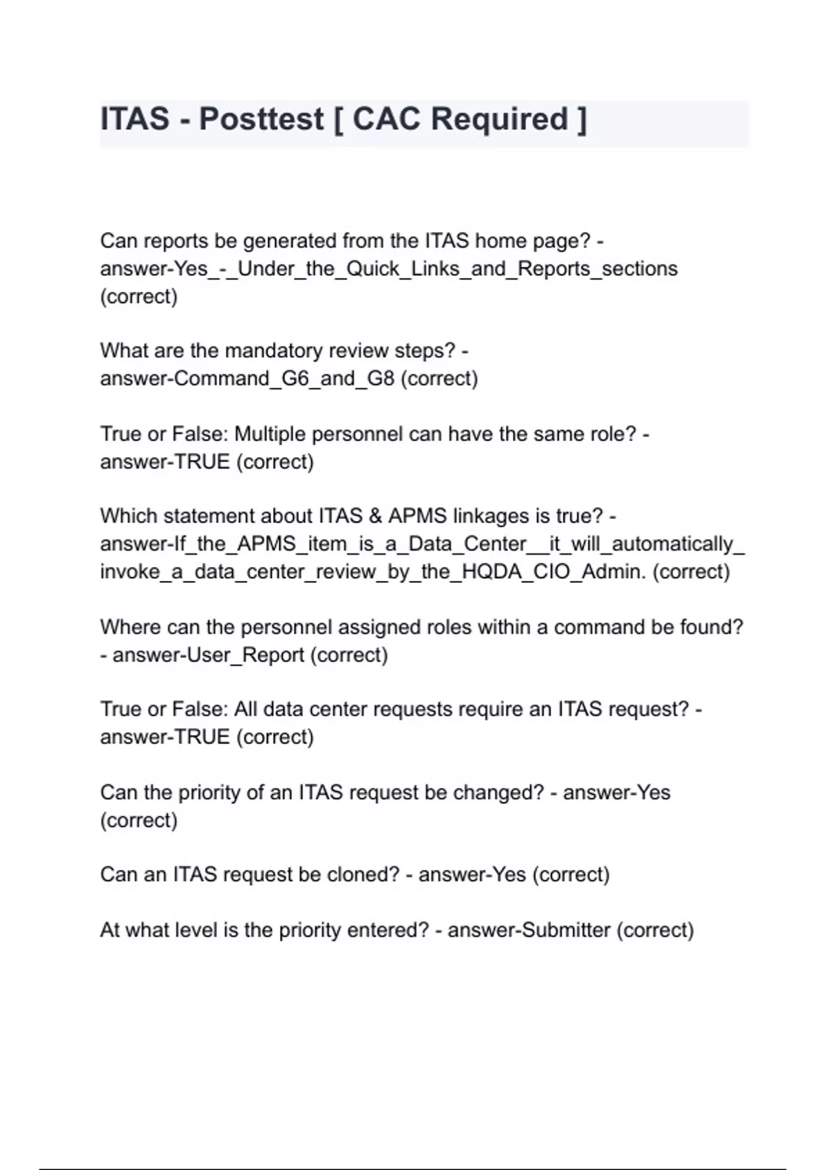 Can reports be generated from the ITAS home page? - answer-Yes_-_Under_the_Quick_Links_and_Reports_sections (correct) What are the mandatory review steps? - answer-Command_G6_and_G8 (correct) True or False: Multiple personnel can have the same role? - answer-TRUE (correct) Which statement about ITAS & APMS linkages is true? - answer-If_the_APMS_item_is_a_Data_Center__it_will_automatically_ invoke_a_data_center_review_by_the_HQDA_CIO_Admin. (correct) Where can the personnel assigned roles within a command be found? - answer-User_Report (correct) True or False: All data center requests require an ITAS request? - answer-TRUE (correct) Can the priority of an ITAS request be changed? - answer-Yes (correct) Can an ITAS reques