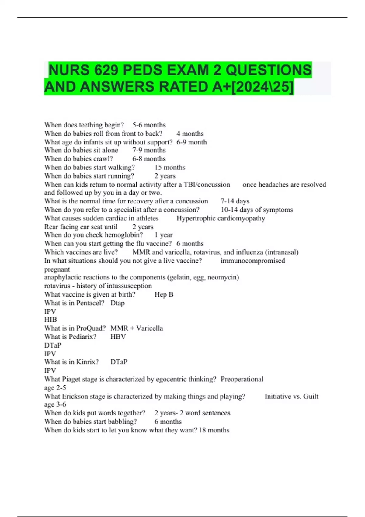 NURS 629 PEDS EXAM 2 QUESTIONS AND ANSWERS RATED A+[202425] When does teething begin? 5-6 months When do babies roll from front to back? 4 months What age do infants sit up without support? 6-9 month When do babies sit alone 7-9 months When do babies crawl? 6-8 months When do babies start walking? 15 months When do babies start running? 2 years When can kids return to normal activity after a TBI/concussion once headaches are resolved and followed up by you in a day or two. What is the normal time for recovery after a concussion 7-14 days When do you refer to a specialist after a concussion? 10-14 days of symptoms What causes sudden cardiac in athletes Hypertrophic cardiomyopathy Rear facing car seat until 2 years When do you check hemoglobin? 1 year When can you start getting the flu vaccine? 6 months Which vaccines are live? MMR and varicella, rotavirus, and influenza (intranasal) In what situations should you not give a live vaccine? immunocompromised pregnant anaphylactic reactions to the components (gelatin, egg, neomycin) rotavirus - history of intussusception What vaccine is given at birth? Hep B What is in Pentacel? Dtap IPV HIB What is in ProQuad? MMR + Varicella What is Pediarix? HBV DTaP IPV What is in Kinrix? DTaP IPV What Piaget stage is characterized by egocentric thinking? Preoperational age 2-5 What Erickson stage is characterized by making things and playing? Initiative vs. Guilt age 3-6 When do kids put words together? 2 years- 2 word sentences When do babies start babbling? 6 months When do kids start to let you know what they want? 18 months points to things they want, uses words to ask for help When does the moro reflex disappear? 3-6 months When does the placing/stepping reflex disappear? 2 months When does the Babinski reflex disappear? 12-14 months When does the fencing reflex disappear? 4-6 months When does the rooting reflex disappear? 3-4 months When does the Grasp reflex disappear? 3-6 months for palmar Average weight gain for Toddler 4-6 lbs/year Average weight gain for Preschooler 5lbs/year Average weight gain for School-age 4 ½ - 6 ½ lbs/year When does the anterior fontanelles close? 18 months-2 years When does the posterior fontanelles close? 2 months At what Tanner stage does puberty start? Stage 2 At what Tanner stage does the voice change in males? Stage 4 At what Tanner stage does the menstrual cycle start? Stage 4 At what Tanner stage does the breast and areola and nipples grow together in one mound. There is no separation yet. Stage 3 Can a 17 year old be seen alone for a physical exam? No. unless it is for STI or suicidal ideation. You can talk to him briefly, but you cannot examine/touch him. Needs to reschedule. leading cause of death in children Injuries due to transportation (occupants of an MVC) Common causes of infant morbidity Falls Getting stuck or trapped Animal Bites Bike injuries Poisonings Playground accidents/falls Obesity-an emerging epidemic! Pincer grasp develops at 9-12 months Name 2 things that would ensure a 1st grader is ready for school Potty trained, can follow simple 3 part commands when can time-out be implemented? at 12-18 months Use positive discipline as well as time-outs and distractions; praise for good behaviors. what do you say to mom of 2 1/2 yr old not potty trained? it's normal What warrants a visit to clinic for newborn before? jaundice; fever over 100.4 What should screen time be limited to 2 hrs or less Anticipitory Guidance at 6 month well check? -Infant will become increasingly mobile -safety locks-stair gates -Hot water thermostat less than 120◦ - avoid Small parts / toys -Poison prevention/know how to contact poison control -No standing water -oral hygiene/soft toothbrush, advise on teething, avoidance of bottle in bed children 6 months to 9 years of age who have never had a flu shot will need? 2 doses of the vaccine, given at least 4 weeks apart What are signs of vitamin D deficiency in children? muscle pain If a baby is strictly breast fed what supplement do they need? vitamin D