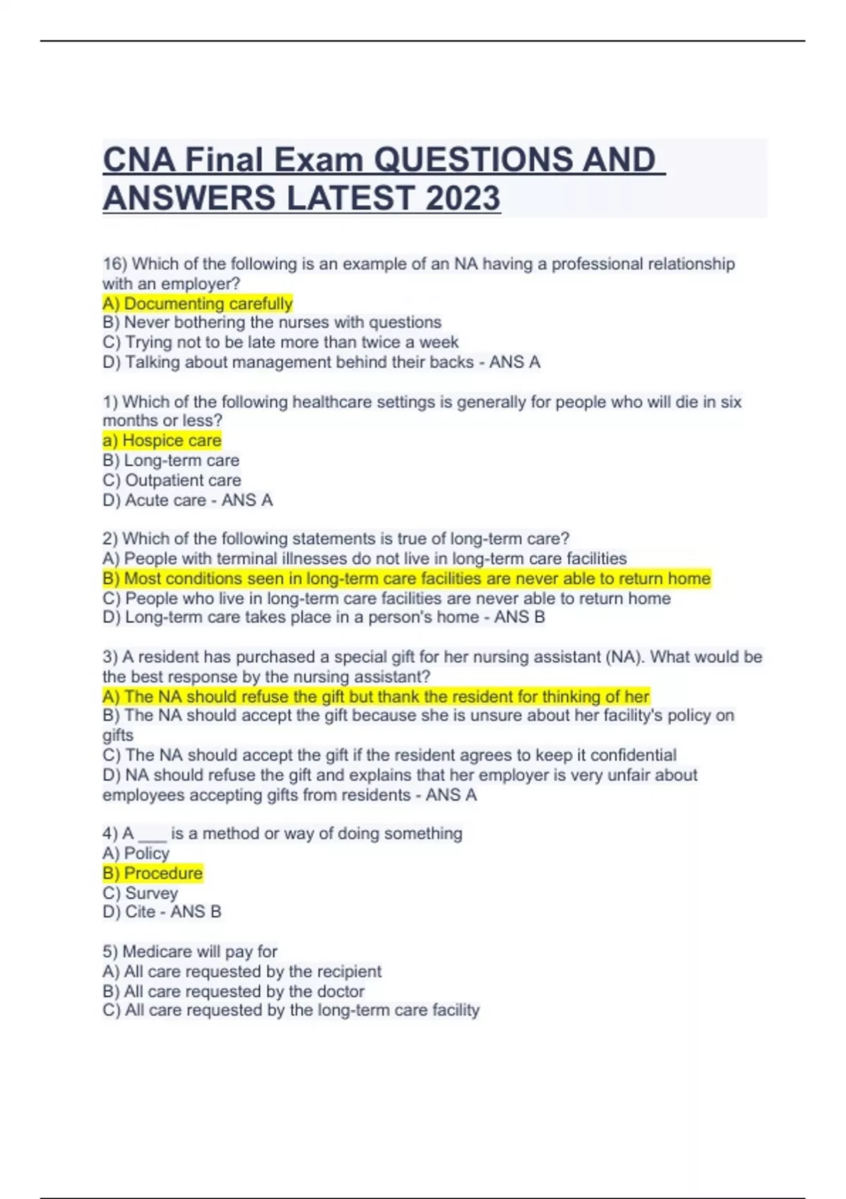 CNA Final Exam QUESTIONS AND ANSWERS LATEST 2023