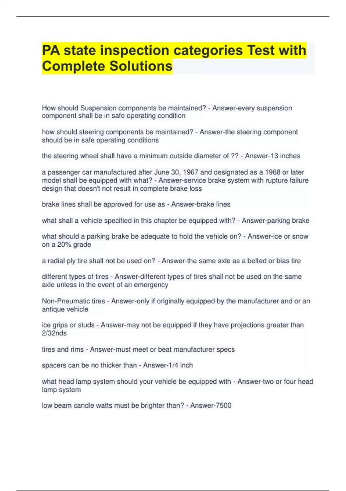 PA state inspection categories Test with Complete Solutions How should Suspension components be maintained? - Answer-every suspension component shall be in safe operating condition how should steering components be maintained? - Answer-the steering component should be in safe operating conditions the steering wheel shall have a minimum outside diameter of ?? - Answer-13 inches a passenger car manufactured after June 30, 1967 and designated as a 1968 or later model shall be equipped with what? - Answer-service brake system with rupture failure design that doesn't not result in complete brake loss brake lines shall be approved for use as - Answer-brake lines what shall a vehicle specified in this chapter be equipped with? - Answer-parking brake what should a parking brake be adequate to hold the vehicle on? - Answer-ice or snow on a 20% grade a radial ply tire shall not be used on? - Answer-the same axle as a belted or bias tire different types of tires - Answer-different types of tires shall not be used on the same axle unless in the event of an emergency