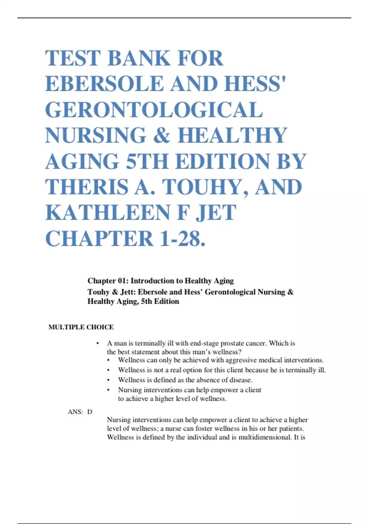 TEST BANK FOR EBERSOLE AND HESS' GERONTOLOGICAL NURSING & HEALTHY AGING 5TH EDITION BY THERIS A. TOUHY, AND KATHLEEN F JET CHAPTER 1-28.