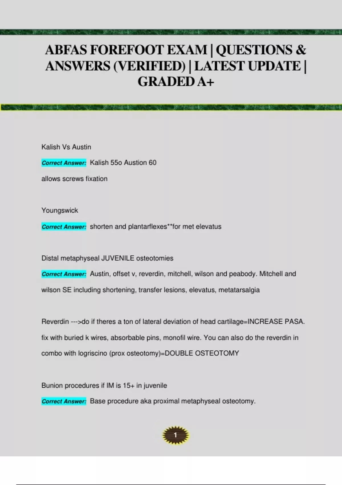 1 ABFAS FOREFOOT EXAM | QUESTIONS & ANSWERS (VERIFIED) | LATEST UPDATE | GRADED A+ Kalish Vs Austin Correct Answer: Kalish 55o Austion 60 allows screws fixation Youngswick Correct Answer: shorten and plantarflexes**for met elevatus Distal metaphyseal JUVENILE osteotomies Correct Answer: Austin, offset v, reverdin, mitchell, wilson and peabody. Mitchell and wilson SE including shortening, transfer lesions, elevatus, metatarsalgia Reverdin --->do if theres a ton of lateral deviation of head cartilage=INCREASE PASA. fix with buried k wires, absorbable pins, monofil wire. You can also do the reverdin in combo with logriscino (prox osteotomy)=DOUBLE OSTEOTOMY Bunion procedures if IM is 15+ in juvenile Correct Answer: Base procedure aka proximal metaphyseal osteotomy. 2 -closed or open base wedge, cresentic procedure, lapidus =goal to make first and 2nd mt parallel without damaging the open physeal plate. Where do you fix PASA vs DASA Correct Answer: Fix pasa with mt head osteotomy like REVERDIN=lat cortex intact proximal cut parallel to 1st mt and distal cut parallel to articular surface Fix DASA W/ proximal akin FIxes PASA Correct Answer: "DROP like Atl" DRATO Reverdin Offset V with rotation Peabody Austin biocorrectional Postion of 1st MPTJ Fusion Correct Answer: neutral rotation of the hallux, 10-15 degrees of valgus 20-30 degrees of dorsiflexion in reference to the axis of the first metatarsal 3 the hallux nail should face upward with no frontal plane rotation, in alignment with the second digit transversely, and just off of the weightbearing surface of a loading plate in the sagittal plane. There are certain consequences that can occur if appropriate positioning is not performed. Too much plantar flexion can cause an increase in stress to the hallux interphalangeal joint, and too much dorsiflexion can make shoe fitting a challenge as well as cause less hallux purchase during gait until late propulsion. Incorrect positioning in the transverse plane could lead to second digit irritation laterally or shoe irritation medially, and frontal plane deviation can cause pain due to overloading of the interphalangeal joint condy Suture material Absorbable (e.g. Vicryl (polygalactin 910), chromic gut) Degraded in tissue in less than 60 days Traditionally used for closure of subcutaneous tissues Non-absorbable (e.g. Ethilon (nylon), silk, Prolene (polypropylene) Lasts longer than 60 days Traditionally used for skin closure Monofilament (e.g. Prolene (polypropylene), plain gut) Made of one strand of material Correct Answer: Abs vs nonabs sutures Multifilament (e.g. Vicryl Rapide (polygalactin 910), silk) 4 Made of multiple strands woven together in a braid More friction when pulled through tissues, however this adds greater security to knots than monofilament Greater risk for inflammation and infection than monofilament (Masini 2011) Correct Answer: monofilament vs. multifilament Natural (e.g. silk, chromic gut) Made of organic materials Traditionally more inflammatory than synthetic materials Synthetic (e.g. Ethilon (nylon), Vicryl (polyglactin 910)) Made of laboratory manufactured material Correct Answer: Synthetic vs non synthetic sutures it courses from medial mal to foot innervates medial and dorsal foot stops at: hallux Correct Answer: Saph nerve terminal branches Lat calcaneal branch lat dorsal cutaneous nerve **suppiles lateral foot Correct Answer: Sural Nerve terminal branch 5 MDCN-1,2,3(medial only) IDCN-5.4.3(lateral only) Correct Answer: Superficial Peroneal Nerve The superficial peroneal nerve or superior fibular nerve, innervates the peroneus longus and peroneus brevis muscles and the skin over the antero-lateral aspect of the leg along with the greater part of the dorsum of the foot (with the exception of the first web space, which is innervated by the deep peroneal nerve). Correct Answer: Innervation of Superficial Peroneal nerve Iv anesthetic, adrenal insuff Correct Answer: SE Etomidate HR - no motion HL decreased from N55-60 normal Correct Answer: HL vs HR a. Joint distraction of the 1st MTPJ via an external fixator. b. Joint function is restored by stretching of periarticular soft tissue structures, which increased functional ROM; intra-articular mechanical stress of the phalanx and MT head are also decreased by increasing the total joint space while the distractor is on. c. Indications: Any patient with symptomatic HL can be Correct Answer: I. Arthrodiastasis for the 1st MTPJ: 6 i. Should only have minimal erosive or degenerative changes with limited DF contraindications Deformity of the 1st metatarsal, i.e. metatarsal elevation Correct Answer: when to consider cheilectomy alone. when not to do it I. Distal Metatarsal Osteotomies: a. Primarily used to help decompress the joint and can be used if the patient has mild or minimal metatarsal primus elevatus. i. Can shorten, plantarflexion, and rotate the capital fragment if dorsal articular cartilage is absent Correct Answer: Distal Metatarsal Osteotomies: 1. mildly shortens the 1st MT. tx metatarsus elevatus 1. Decompresses joint space but does not correct structural elevation within the MT removing wedge* 7 reducing content of the capsular tissue, relaxing the periarticular soft tissue and permitting increased ROM, Correct Answer: Waterman*Dorsally based CW that derotates intact articular cartilage dorsally *Removal of trapezoidal wedge of bone from the 1st metatarsal head with its base dorsally. 1. Removes small section of bone to provide more dramatic relaxation of the flexor apparatus. Goal of procedure is to provide enough shortening tension off flexor structures +displace the 1st met head plantarly No actual rotation of cartilage occurs. Correct Answer: a. Modified Green-Waterman Osteotomy central MT head, Dorsal arm is perpendicular to the long axis of the 1st MT; second dorsal arm is parallel to the first **remove bone/ shortening. Indications: Hallux limitus with increase in IMA 8 i. Dorsal cuts must be parallel to prevent to