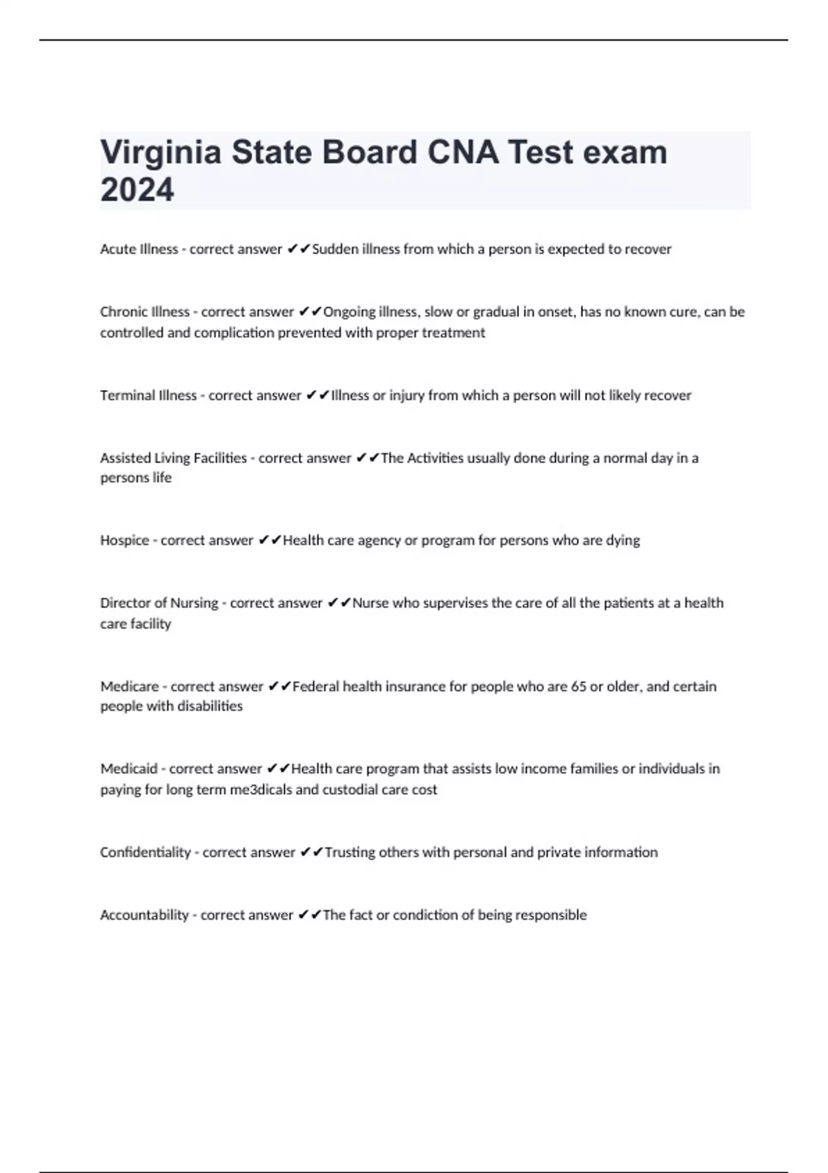 Acute Illness - correct answer Sudden illness from which a person is expected to recover Chronic Illness - correct answer Ongoing illness, slow or gradual in onset, has no known cure, can be controlled and complication prevented with proper treatment Terminal Illness - correct answer Illness or injury from which a person will not likely recover Assisted Living Facilities - correct answer The Activities usually done during a normal day in a persons life Hospice - correct answer Health care agency or program for persons who are dying Director of Nursing - correct answer Nurse who supervises the care of all the patients at a health care facility Medicare - correct answer Federal health insurance for people who are 65 or older, and certain people with disabilities Med